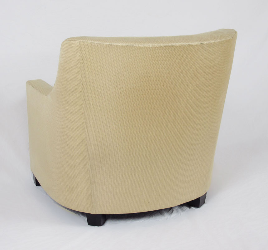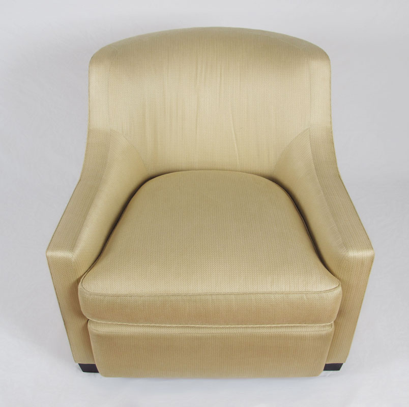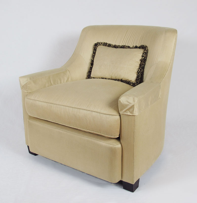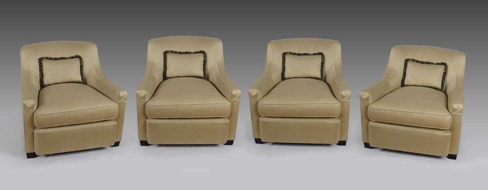 MATCHED SET OF 4 BAKER FURNITURE CLUB CHAIRS: Cream colored upholstered chairs on mahogany block feet. Sold with the fringed pillows. Approx. 33''h. x 34''w. x 39'' deep.