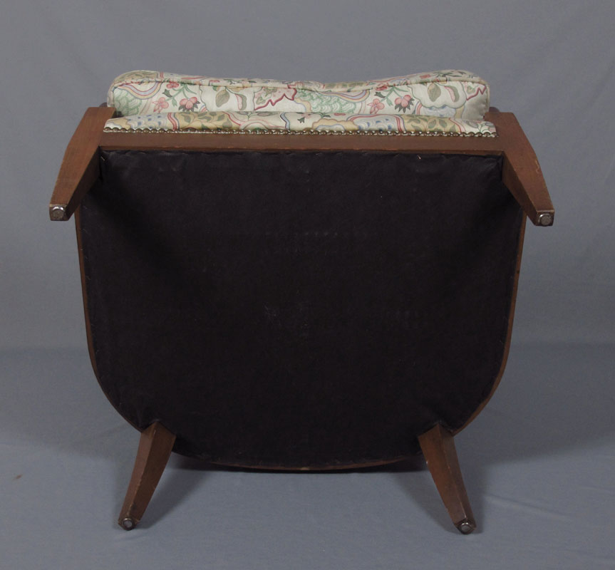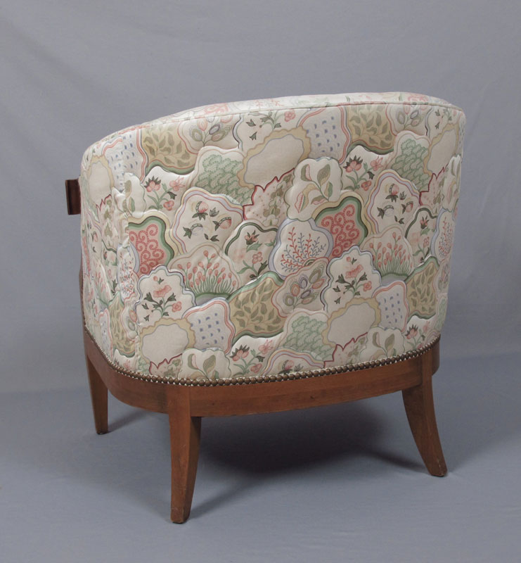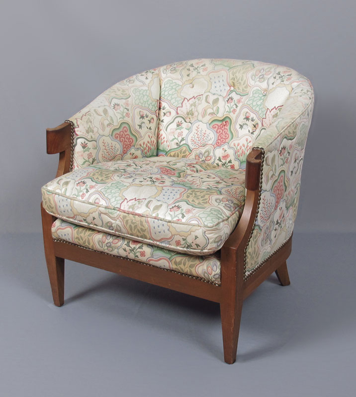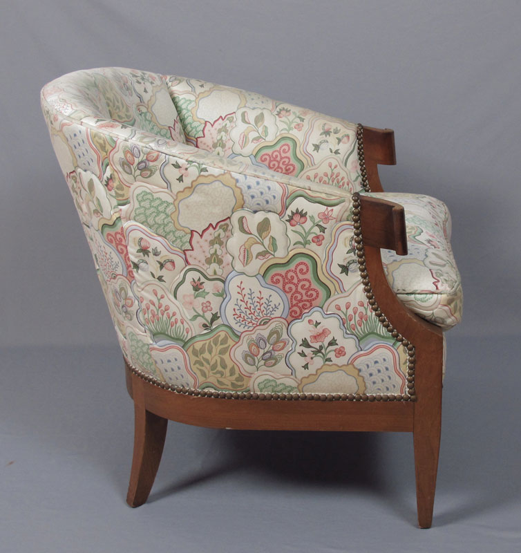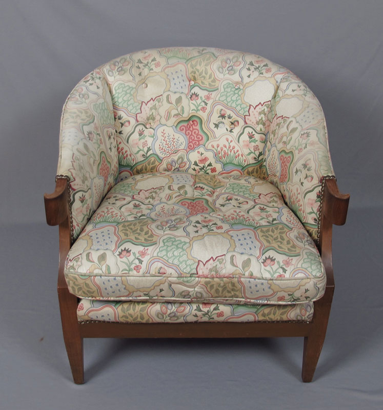 BAKER PARLOR CLUB CHAIR: Lively upholstery with tacks. 28 1/4'' h. x 28'' x 30 1/4''