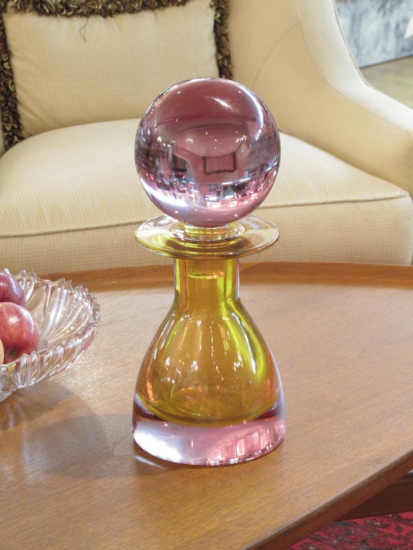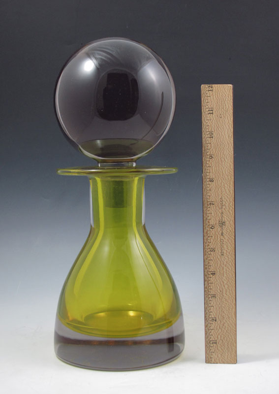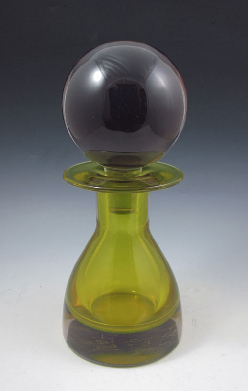 A COLOSSAL MURANO GLASS BOTTLE WITH STOPPER: Numbers inscribed on the underside, unsigned. 14 1/2'' tall, the round stopper 6'' dia.