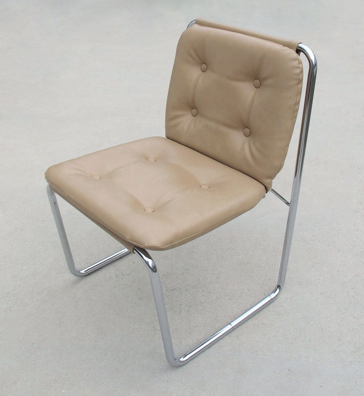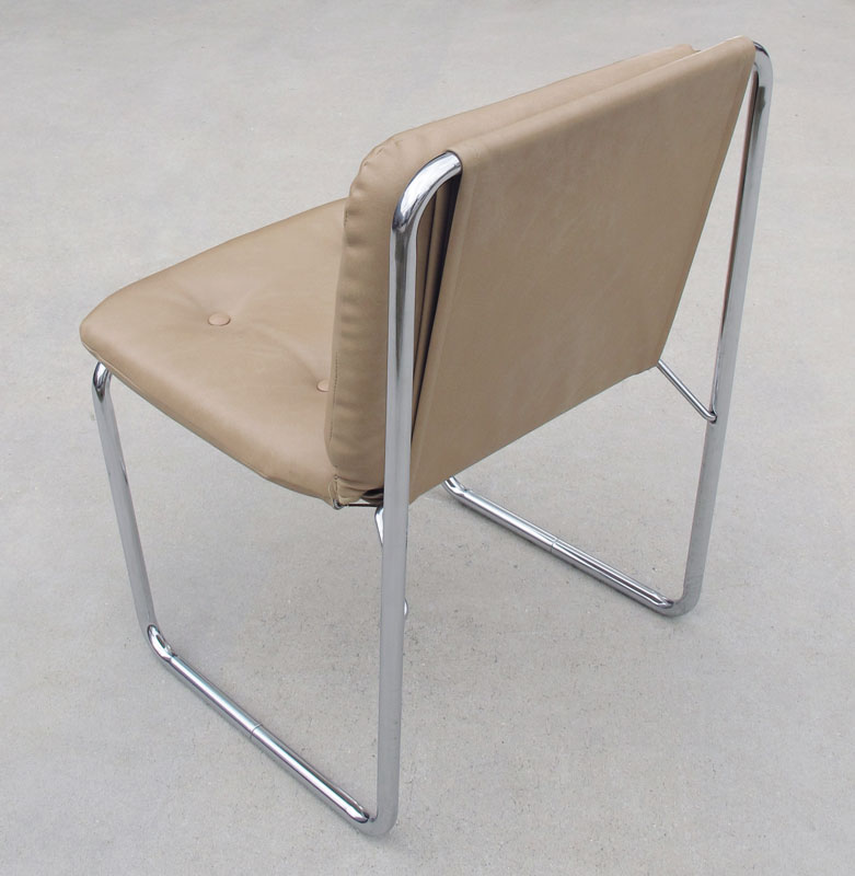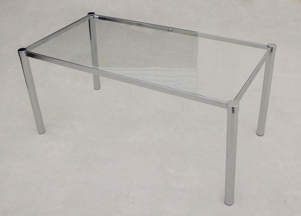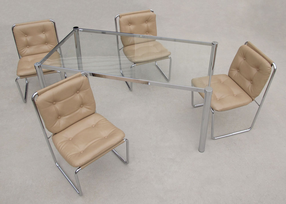 ITALIAN GLASS TOP DINING TABLE & 4 LEATHER CHAIRS: Fitted glass top, chrome frame and cylinder legs. 4 beige leather and chrome frame chairs. Table 29'' h. x 63'' x 33'', chairs 31'' h. x 20'' x 23 1/2''.