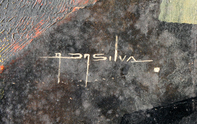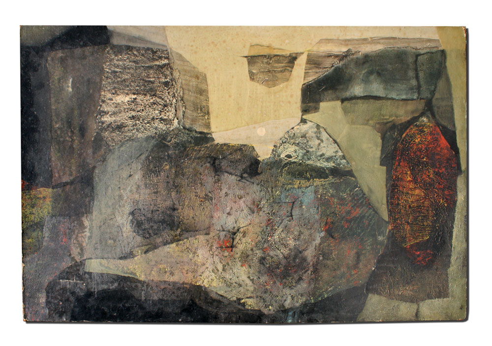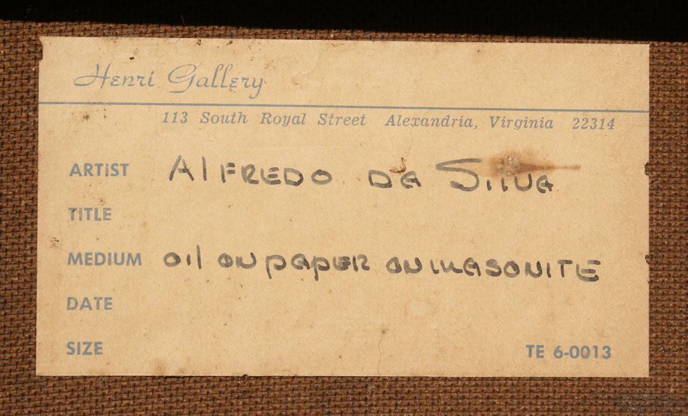 DA SILVA, Alfredo, (American, 20th c.): Abstract Composition on Masonite, Mixed Media Oil and Collage, 27 3/4'' x 45 3/4'', signed lower left, Henri Gallery label verso.