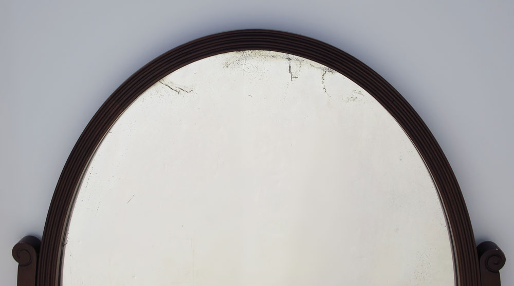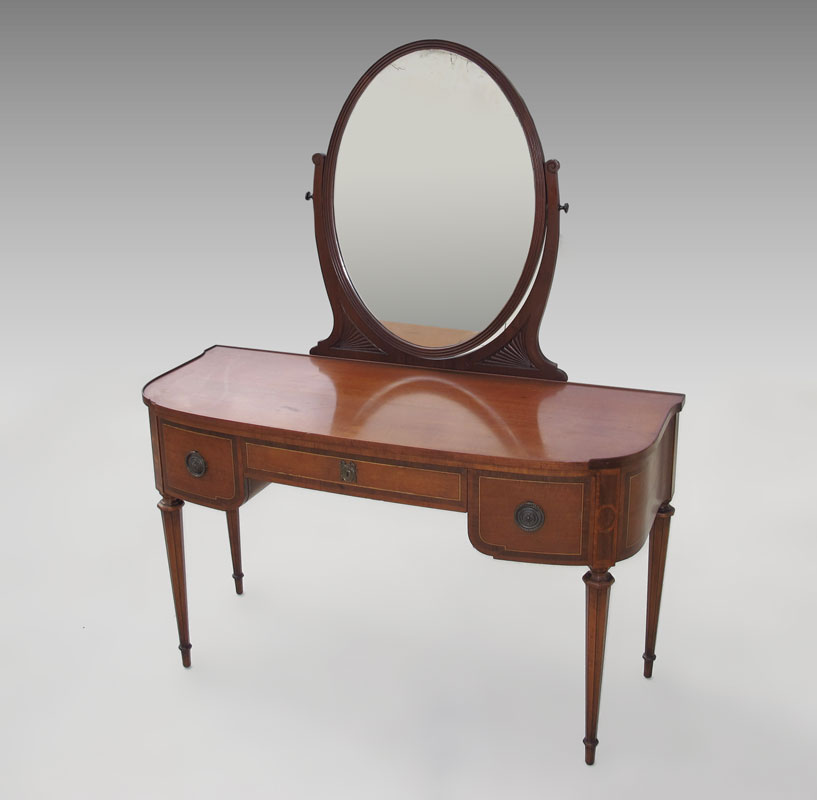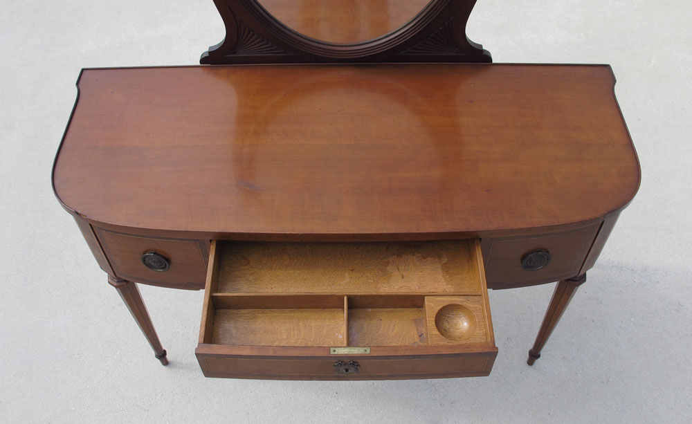 JOHN WIDDICOMB FRENCH STYLE DRESSING TABLE WITH MIRROR: A graceful design with large oval ribbed mirror on swing supports. Banded drawers and sides, shaped tapered legs. Approx. 63'' tall x 51 1/2'' wide x 21'' deep.