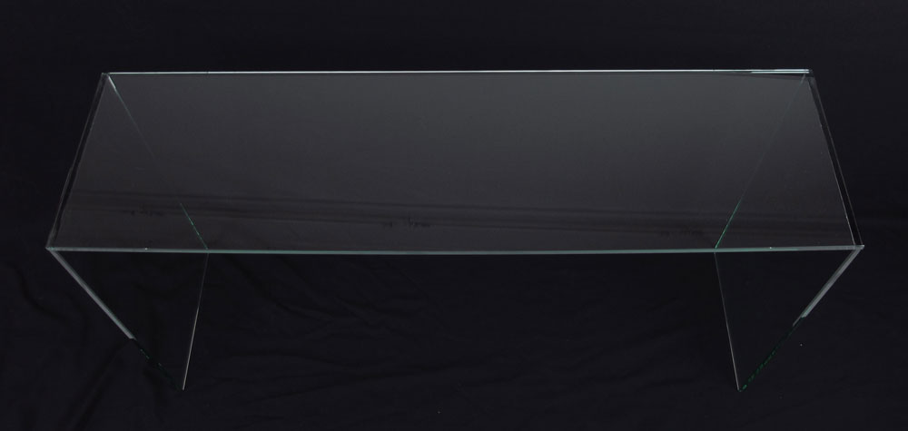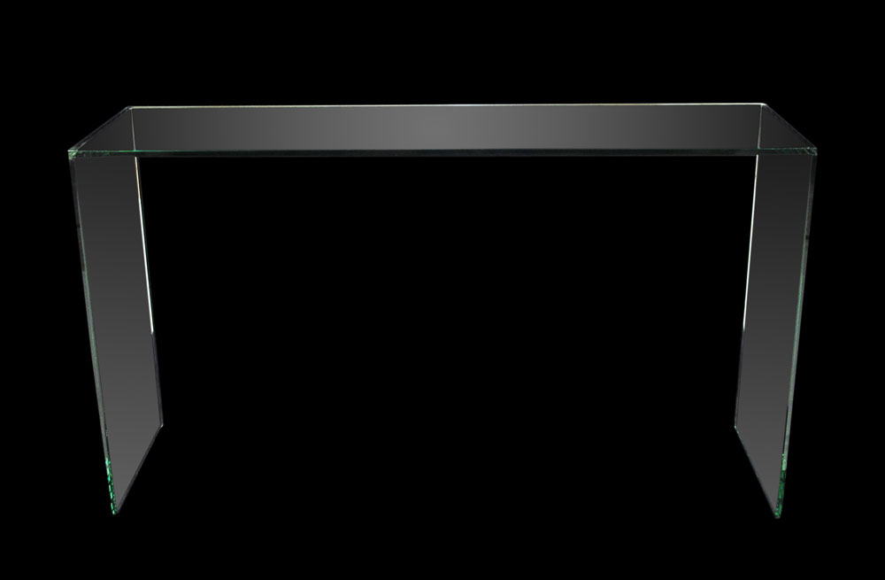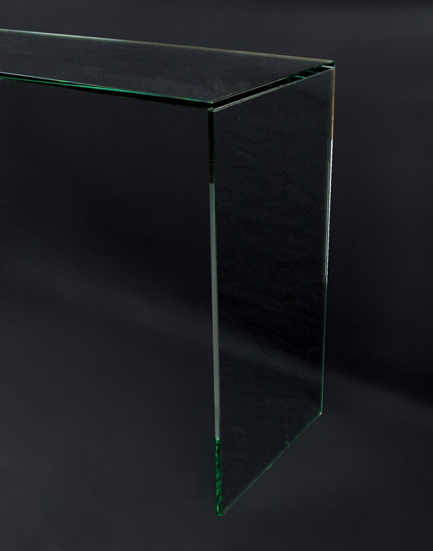 CONTEMPORARY ALL GLASS CONSOLE TABLE: Clean lines, 3 piece glass, polished edge with green tint. 28'' h. x 51'' x 14''.