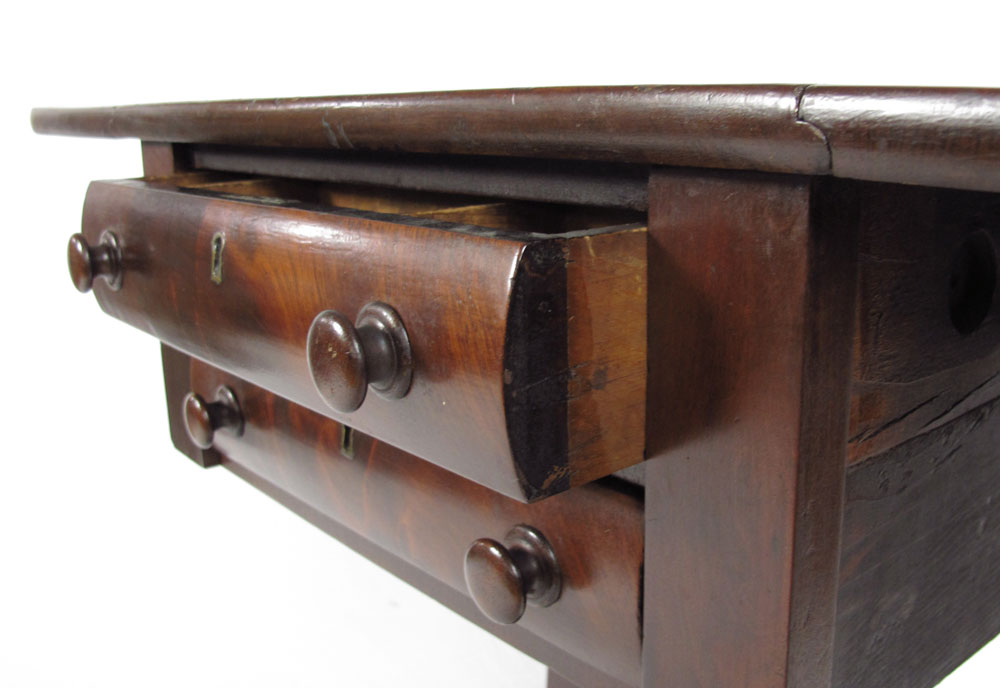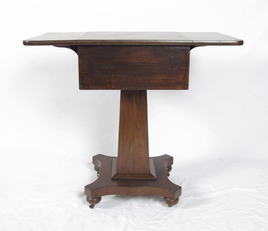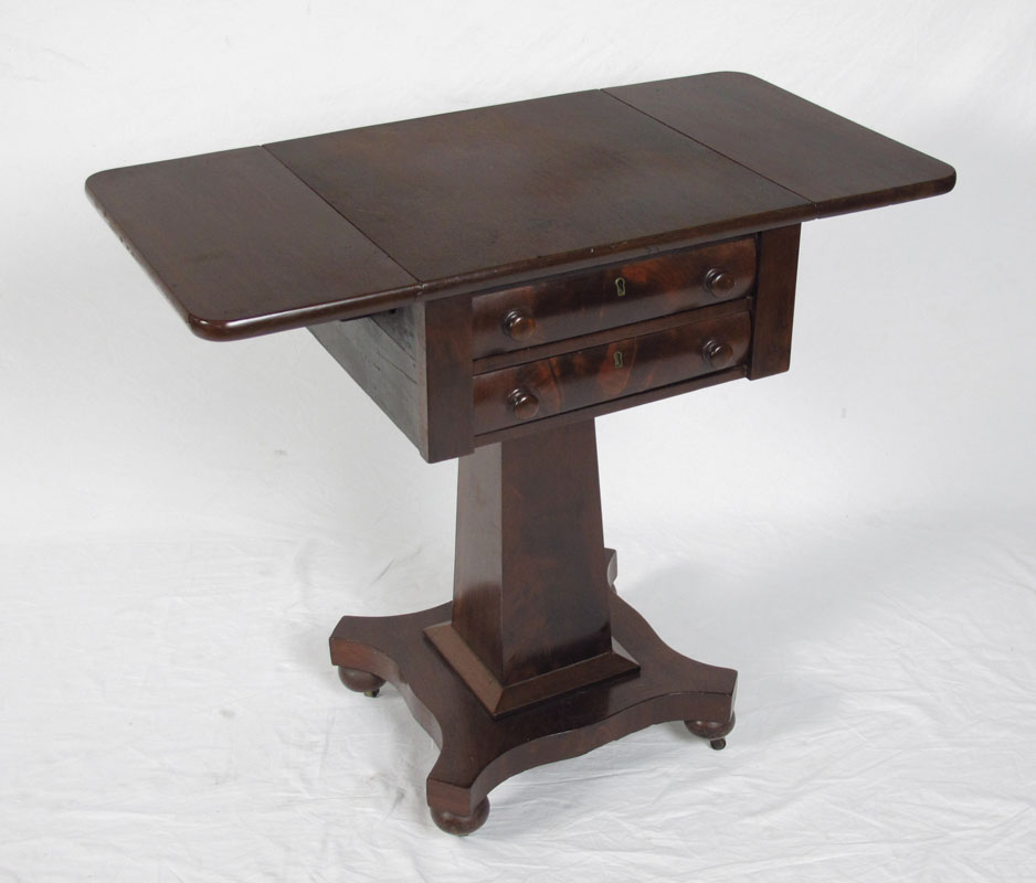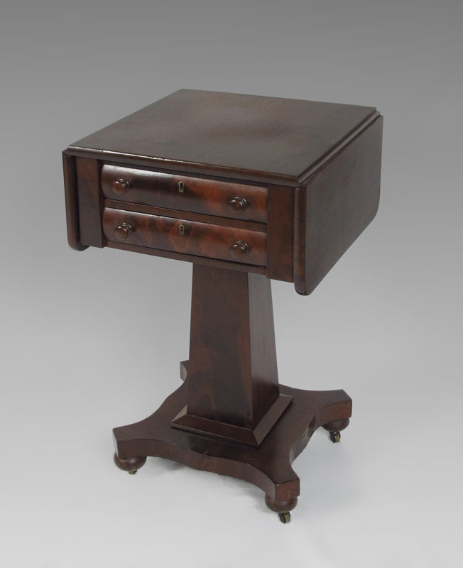 AMERICAN EMPIRE 2 DRAWER WORK STAND: Drop leaf, 2 drawer stand on squared pedestal base, ball feet on casters, 28 1/2'' tall x 17'' x 17''.