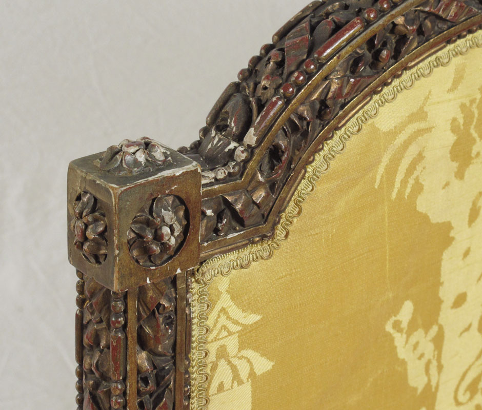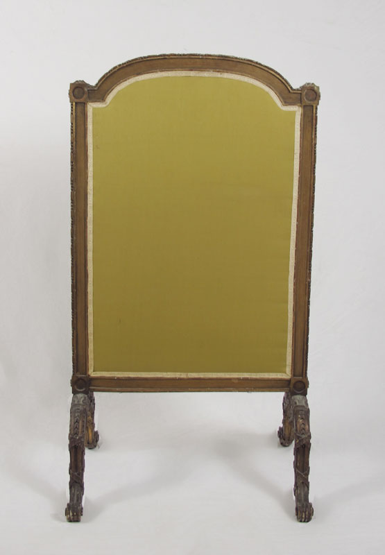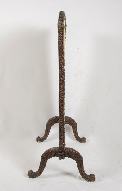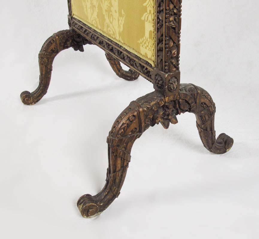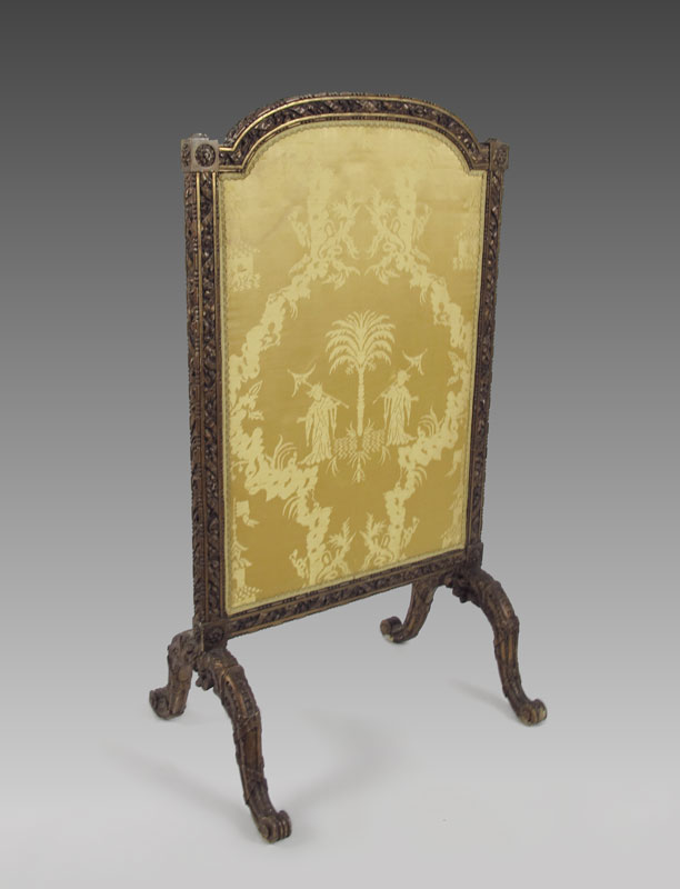 19TH CENTURY CARVED AND GILT FIRE SCREEN: Overall carved frame on scrolled legs. Aged gilt over red paint. Upholstered on both sides with silk brocade in oriental motif. 44'' h. x 24 1/2'' x 18''.