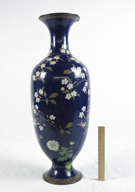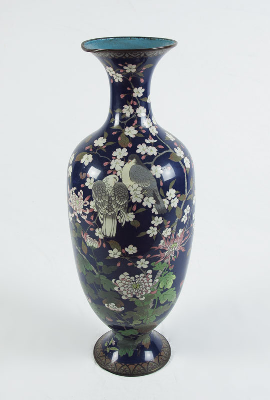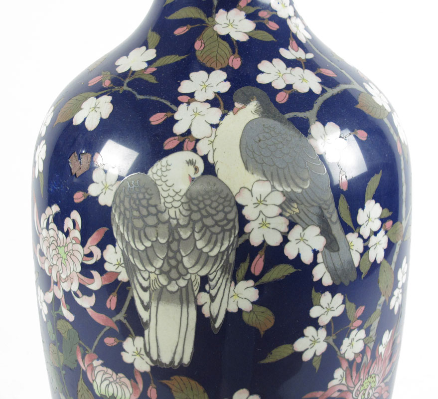 PALATIAL 36'' TALL CLOISONNE VASE: Lovebirds and floral decoration.