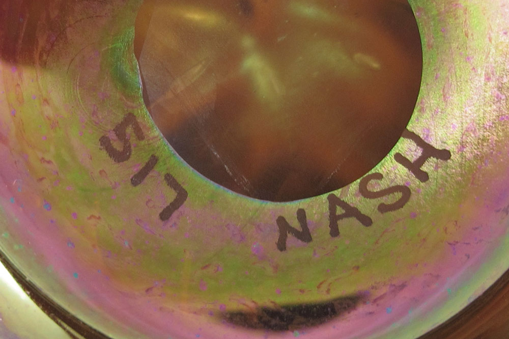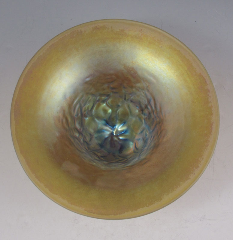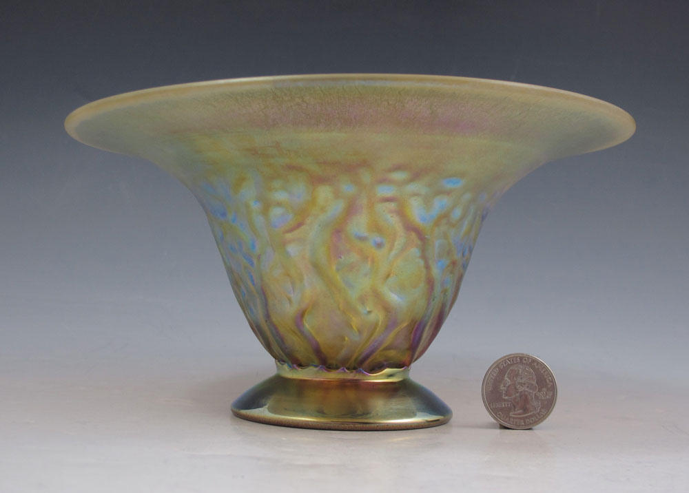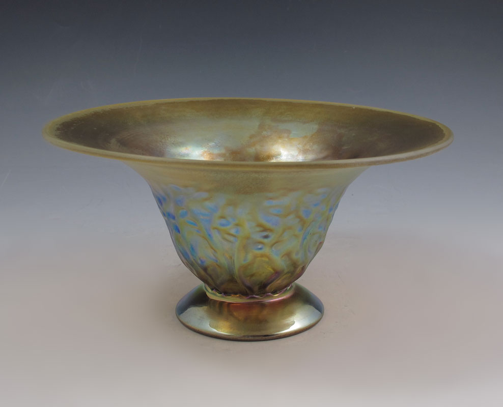 NASH IRIDESCENT ART GLASS BOWL, CA. 1928-1931: Pedestal bowl with textured exterior, signed Nash 517. Measures 4'' h. 7 1/2'' dia.
