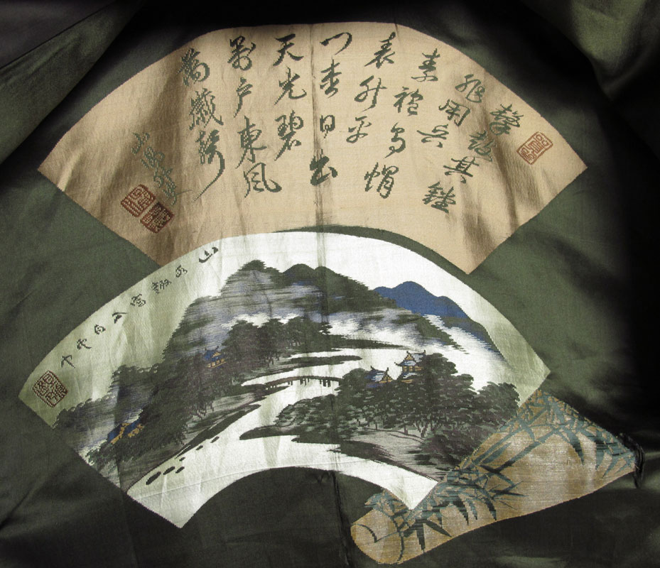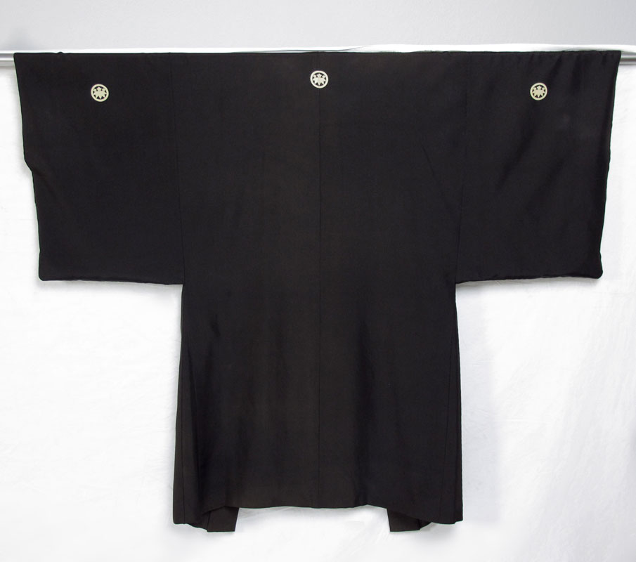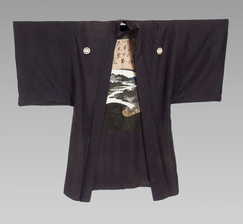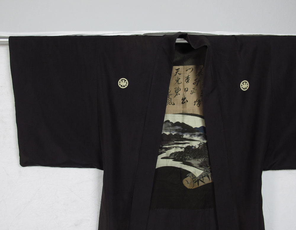 JAPANESE BLACK SILK KIMONO: Jacket having a decorative silk panel on the interior. Approx. 43''l.