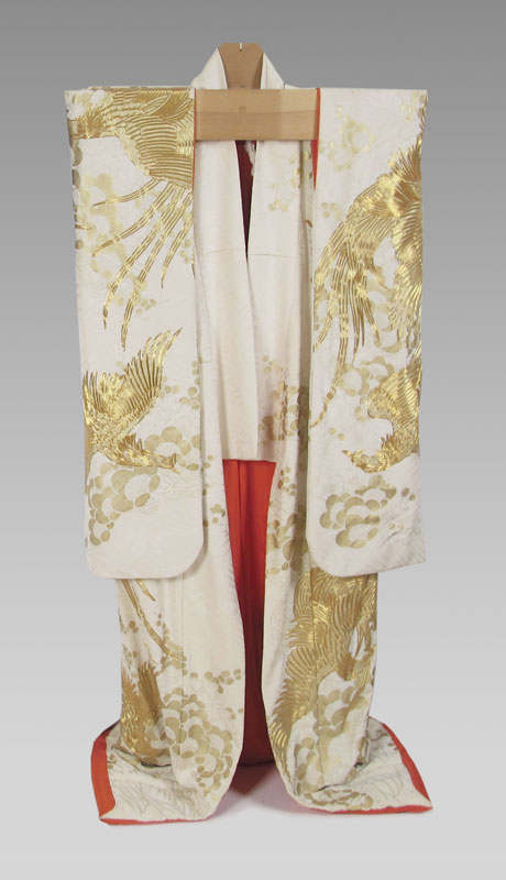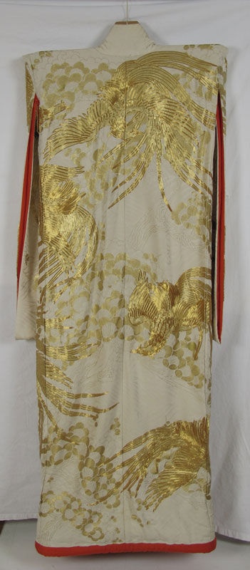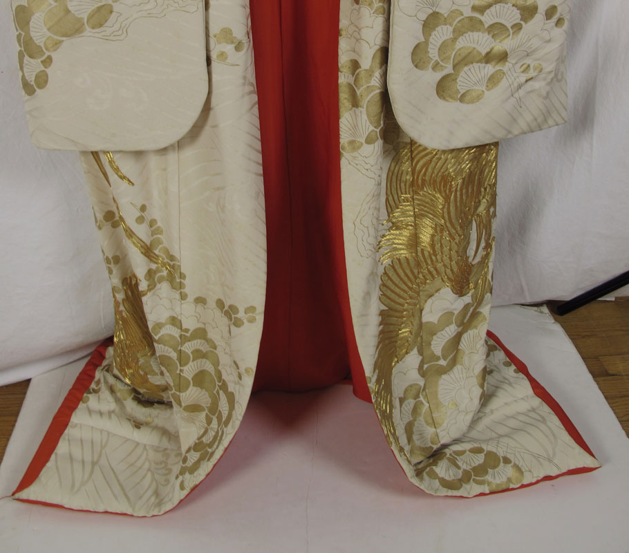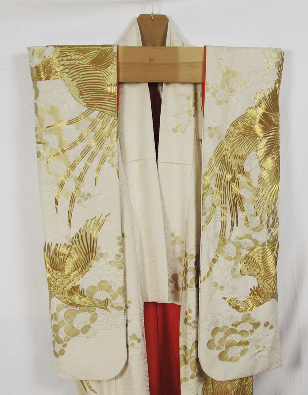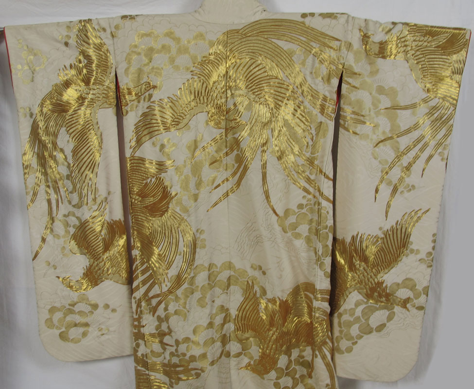 JAPANESE WEDDING KIMONO: Exquisitely embroidered with gold threads in an all over Phoenix bird design. Approx. 6; long.