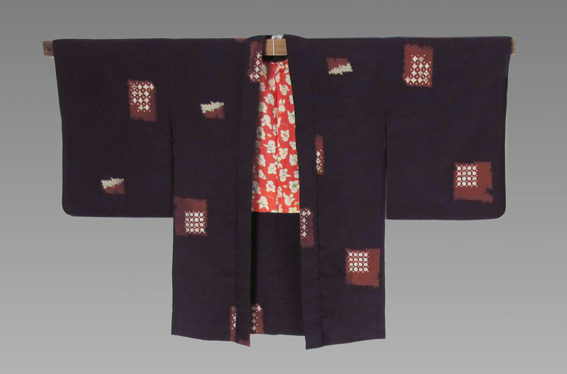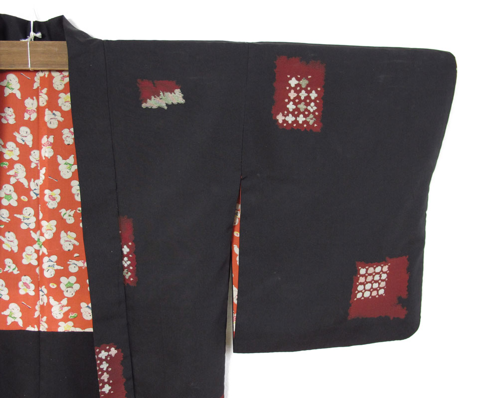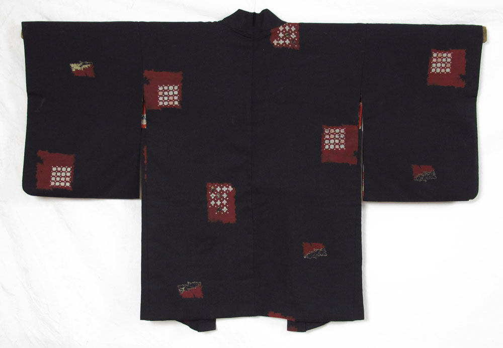 JAPANESE KIMONO: Jacket with red and white woven design and lively figural lining. Approx. 31''l.