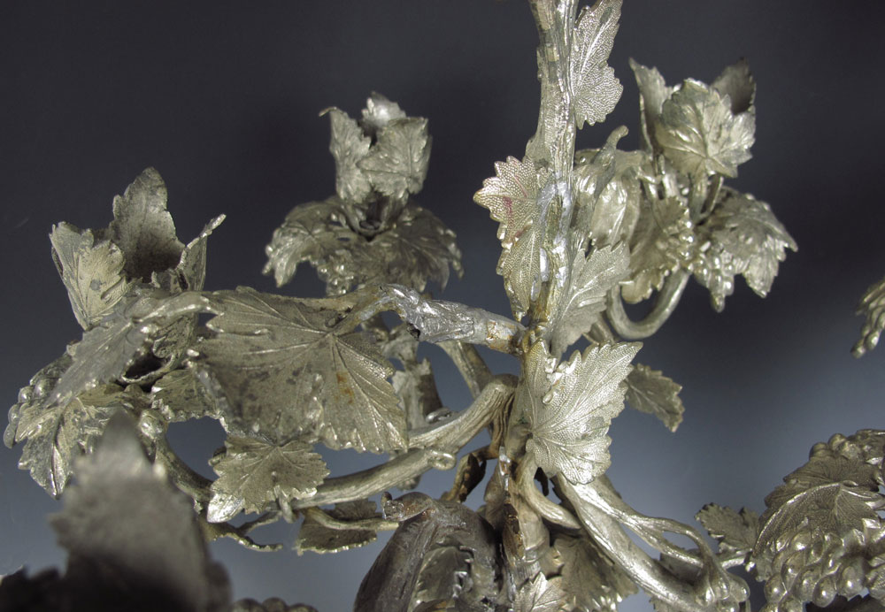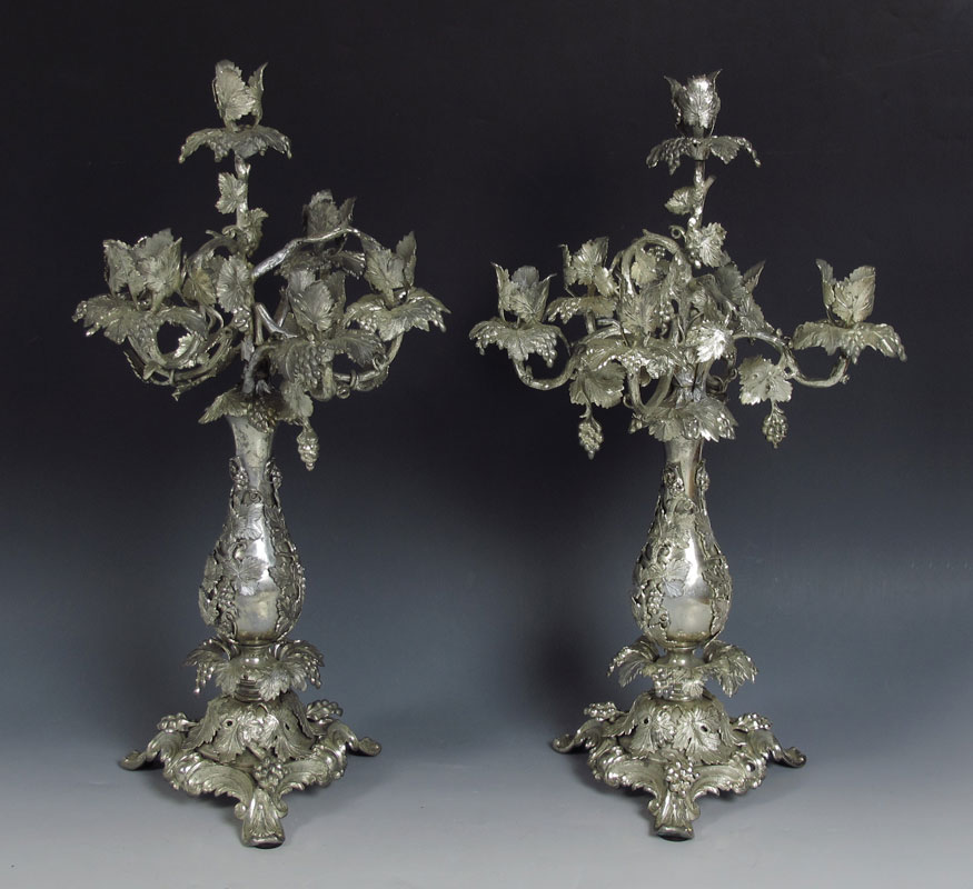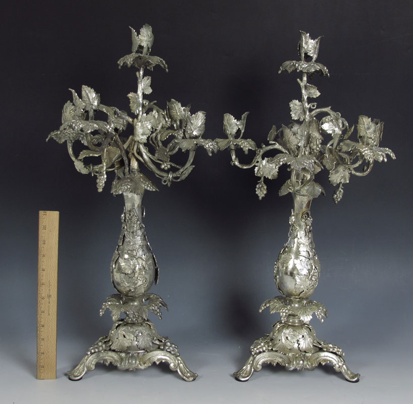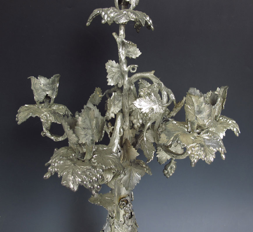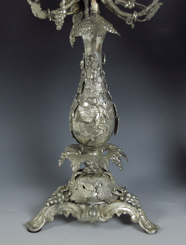 ORNATE GRAPE AND VINE DESIGN FIGURAL CANDELABRA: 25'' tall. Silvered finish over white metal six light candelabra.