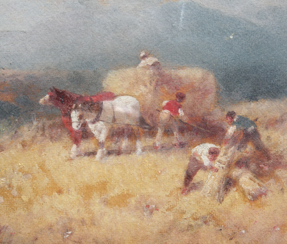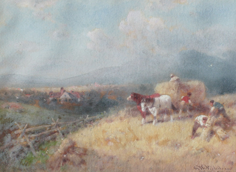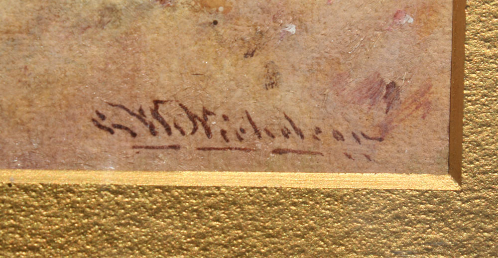 NICHOLSON, George Washington, (American, 1832-1912): Pennsylvania Haying scene, Watercolor and OIL/Board, 10'' x 14'', signed, gilded frame with wear and repair, 18'' x 22''.
