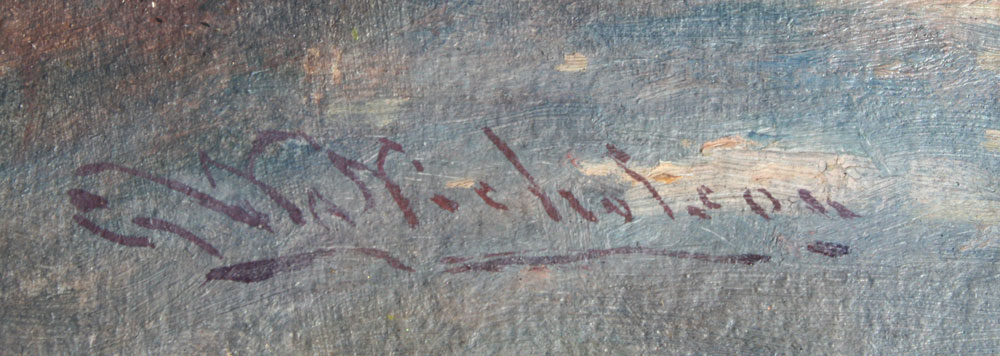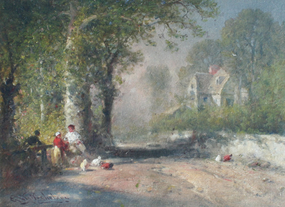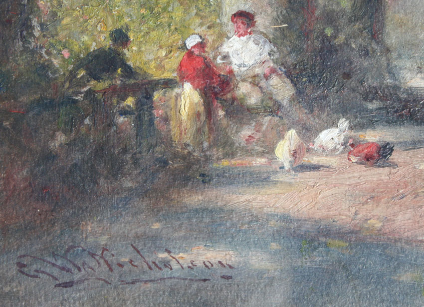 NICHOLSON, George Washington, (American, 1832-1912): Country Road with Figures at Rest, Chickens and Country Estate in Background, OIL/Board, sight size 10'' x 14'', signed, gilded frame with wear and repair, 18'' x 22''.