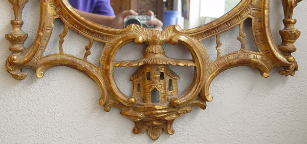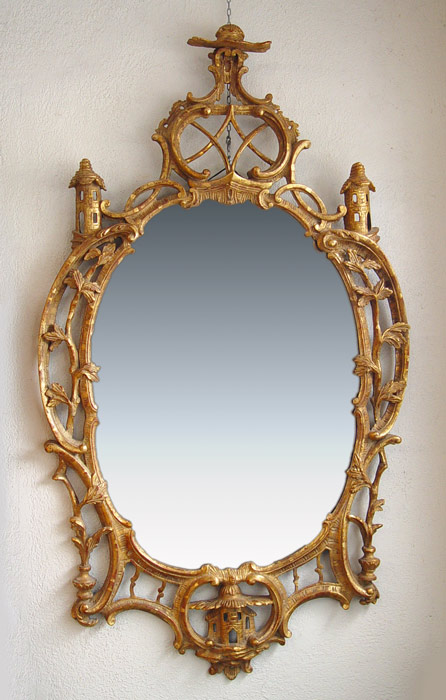 CARVED AND GILTWOOD OVAL MIRROR: Scroll and vine frame with architectural features, 44'' x 26''.
