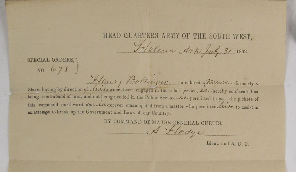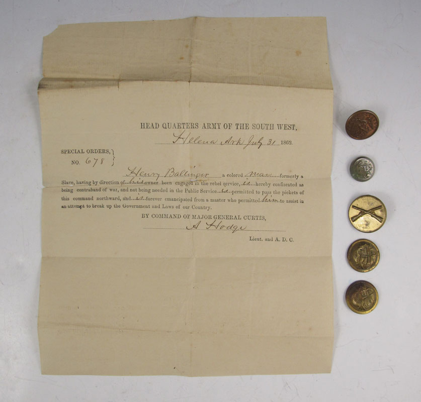 CIVIL WAR EMANCIPATION & BUTTONS: Special Orders for safe passage for a freed slave allowing him go North unimpeded. Signed by Lieut. A. Hodge, Helena Ark. July 31, 1862. Sold with 5 assorted era buttons including GAR, naval, Fire Dept. and infantry.