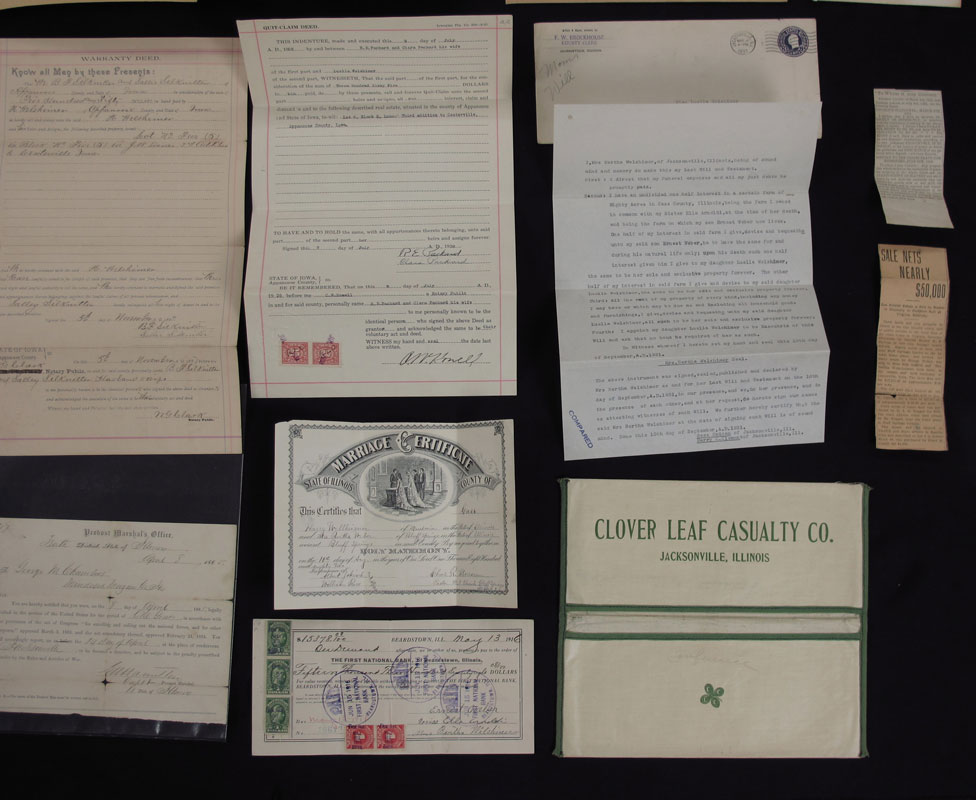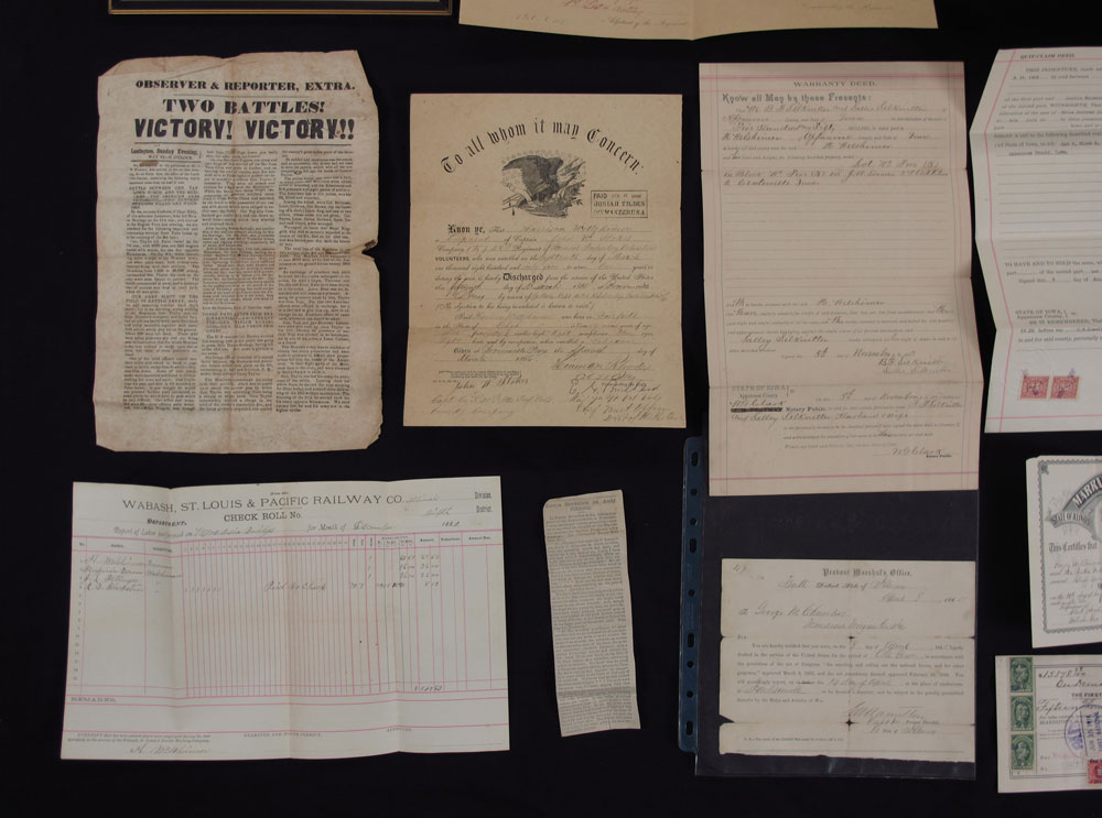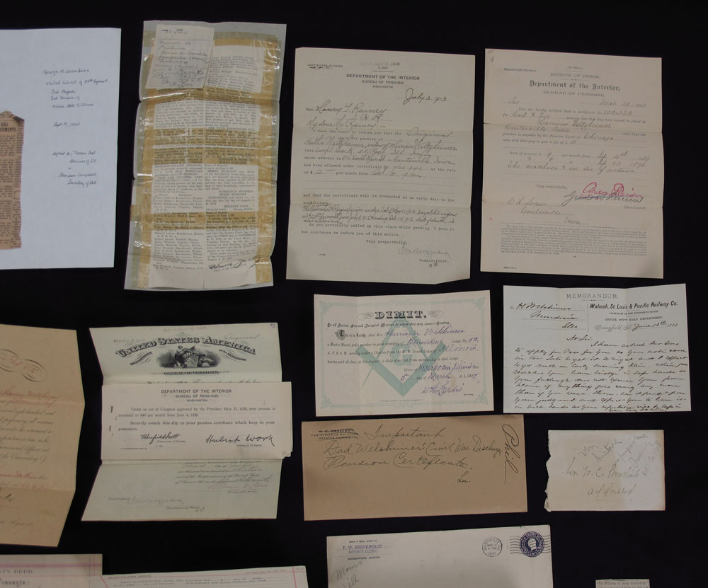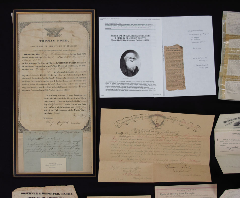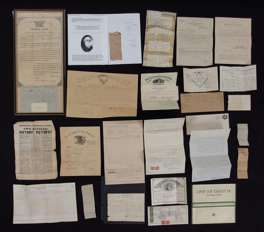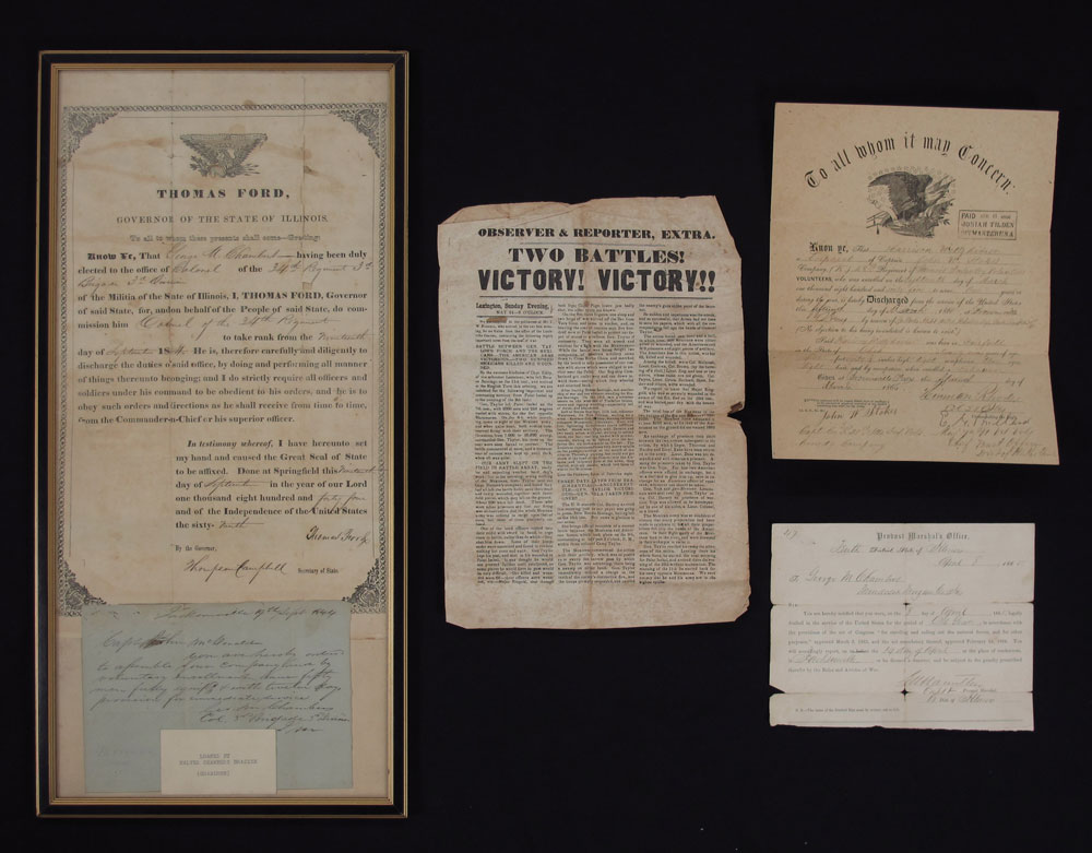 COLLECTION OF ILLINOIS CIVIL WAR EPHEMERA: To include 1) Commission to George Maxwell Chambers by Gov. Thomas Ford to rank of Colonel in the 34th Regiment Illinois Militia. Signed by Gov. Ford & Thompson Campbell, Secretary of State, dated Sept. 19, 1844. Note seam tears. In same frame is a order from Colonel Chambers to Capt. John McDonald to have 50 men ready. 2) Draft notice dated April 8, 1865. 3) Mexican War Announcement of victory in 2 battles. Note heavy folds and seam tears. 4) March 1865 appointment of Harrison Weltzhimer to Corporal, Co. K, 28th Regt. Illinois & 1866 discharge of Weltzhimer. 5) Assorted pensions, deeds and other items.