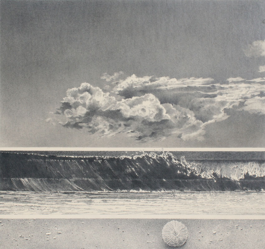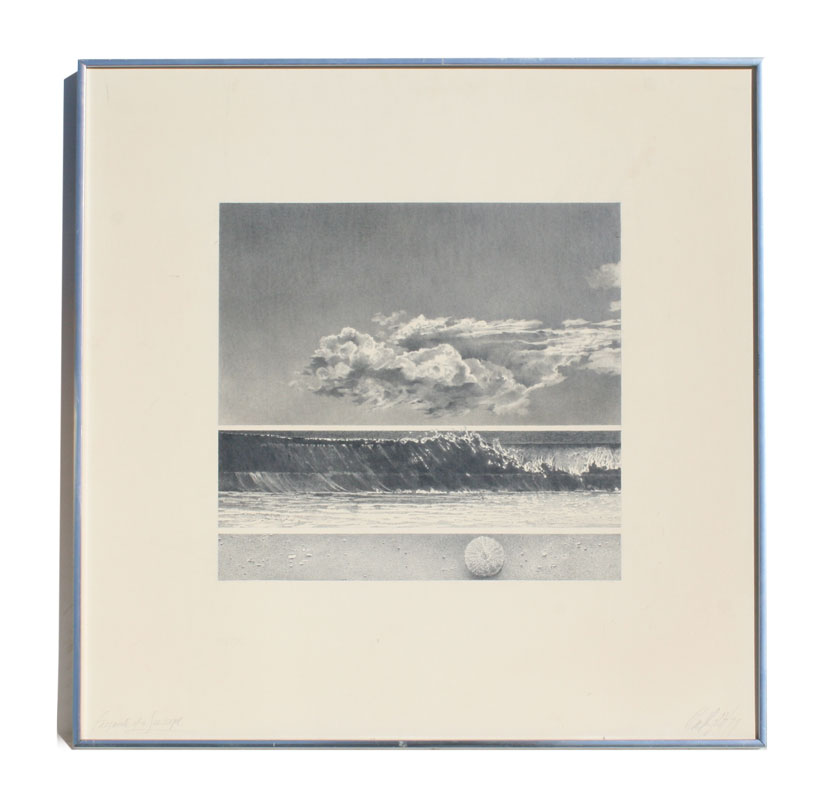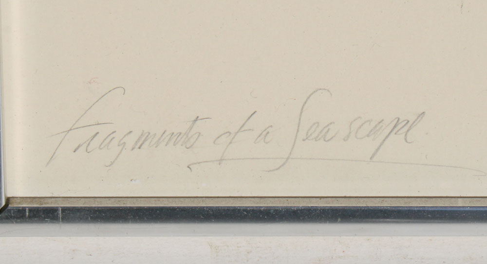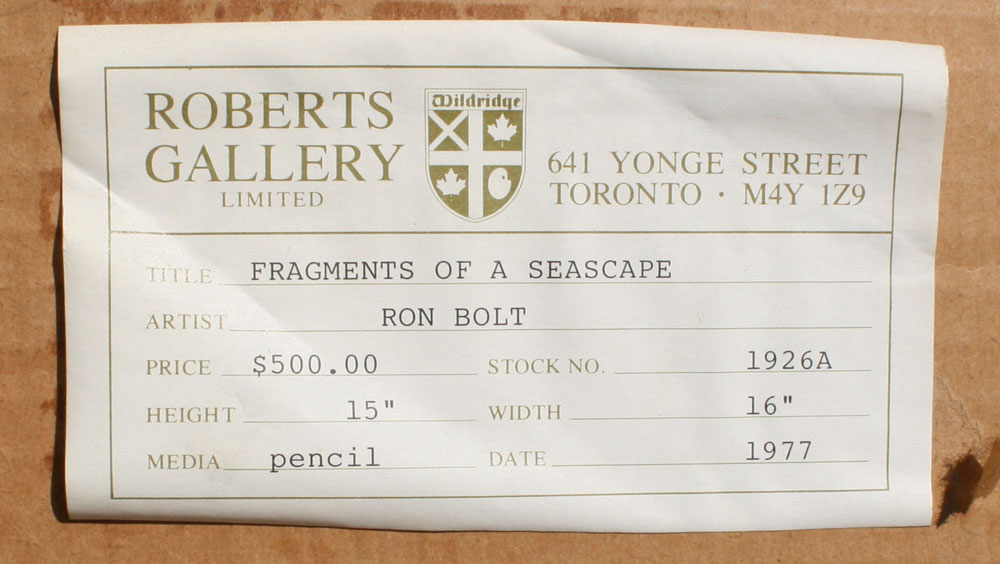 BOLT, Ron, (Canadian, 1928-): ''Fragments of a Seascape'', Seashore with Crashing Surf, pencil drawing, 26'' 1/2'' x 26 1/2'' sight size, pencil signed lower right, dated 77', titled verso, framed 27'' x 27''. Roberts Gallery Toronto Canada label verso.