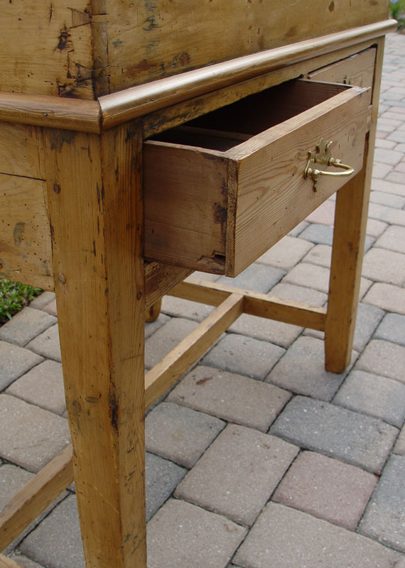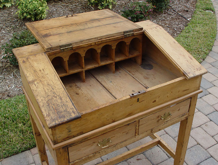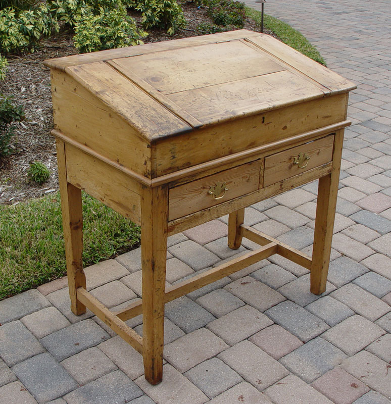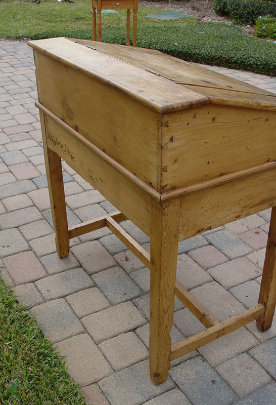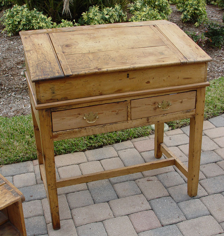 ANTIQUE PINE LIFT TOP TEACHERS DESK LECTURN: Slanted writing surface raises to reveal cubbied storage space, over two drawers with replacement brass pulls, slightly tapered legs with cross stretcher, dovetail and peg construction. 40 1/4''h. at back, 36''h. at front, 37''w. x 23''d.