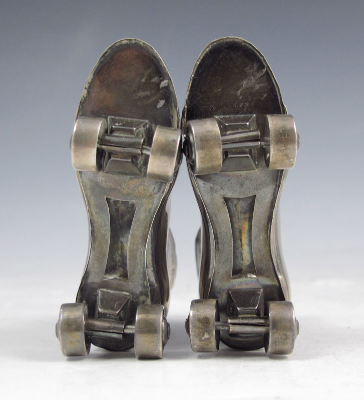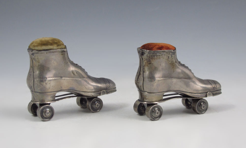 WHIMSICAL EDWARDIAN SILVER ROLLER SKATE FIGURAL PIN CUSHIONS: Bear the hallmarks for Crisford & Norris, 1909 Birmingham. Strand Lodge 1987 1910 impressed on each. 2''h. x 2 3/4''.