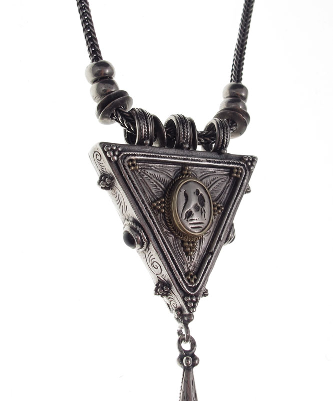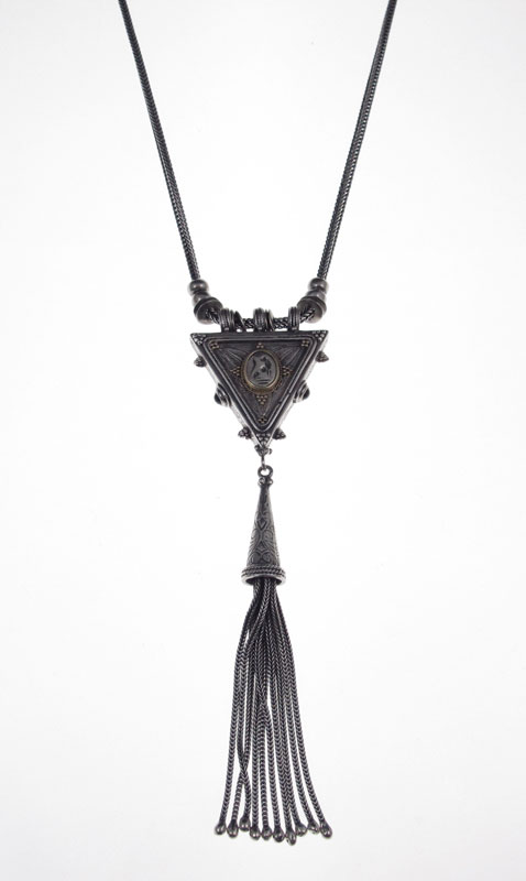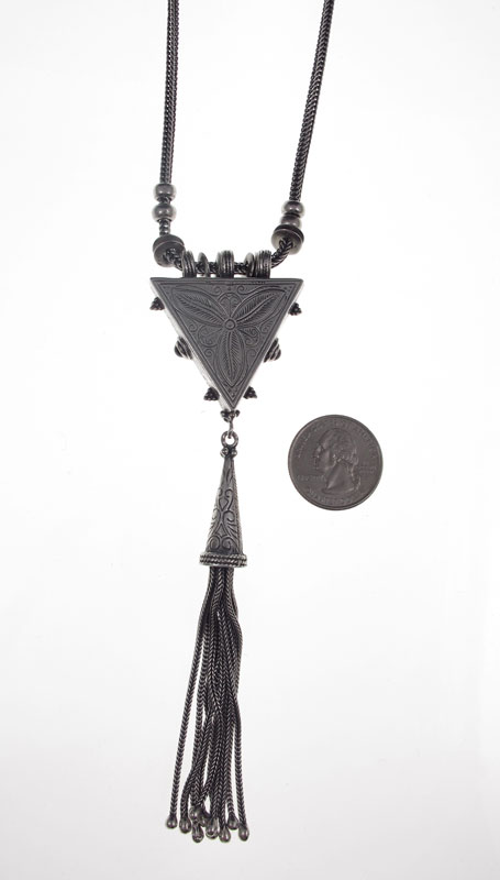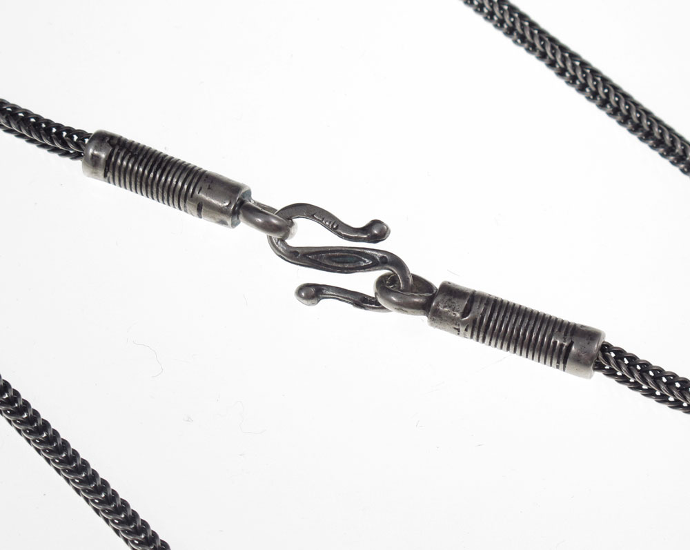 EDWARDIAN STERLING TASSEL NECKLACE: The central decoration of foxtail fringe suspended from triangular slide, the chain fitted with disc and ball slides. Hook closure. 26'' chain, fob and fringe an additional 5''. Weight 80 grams.