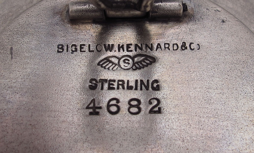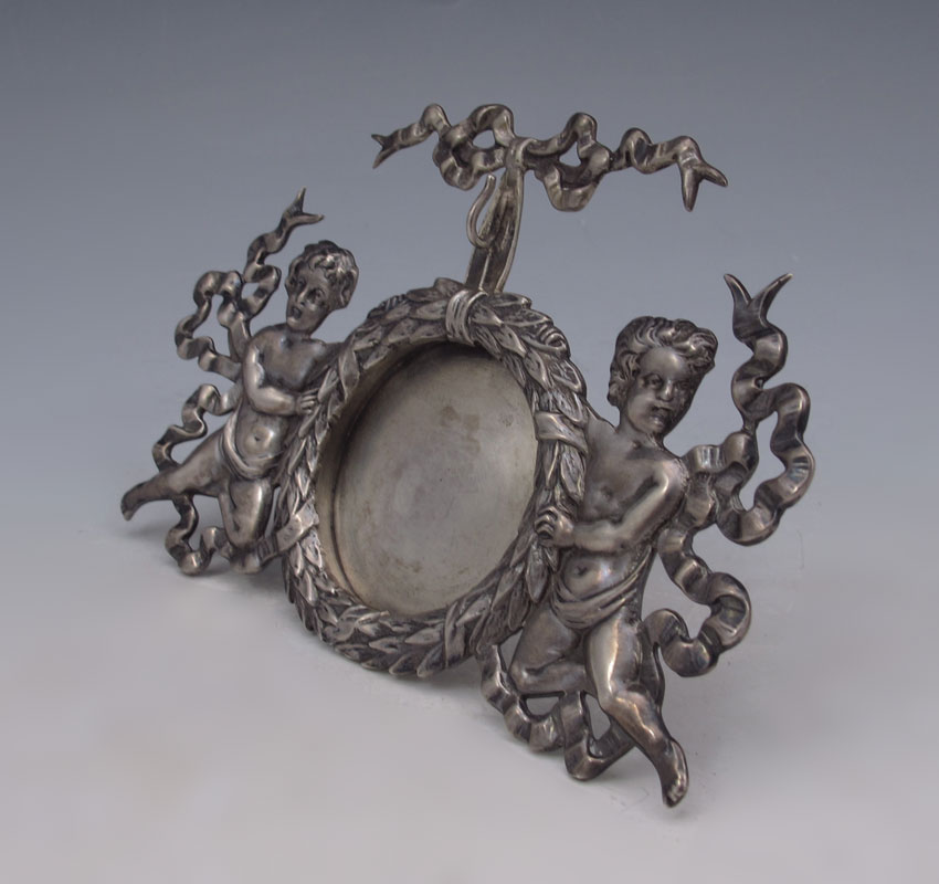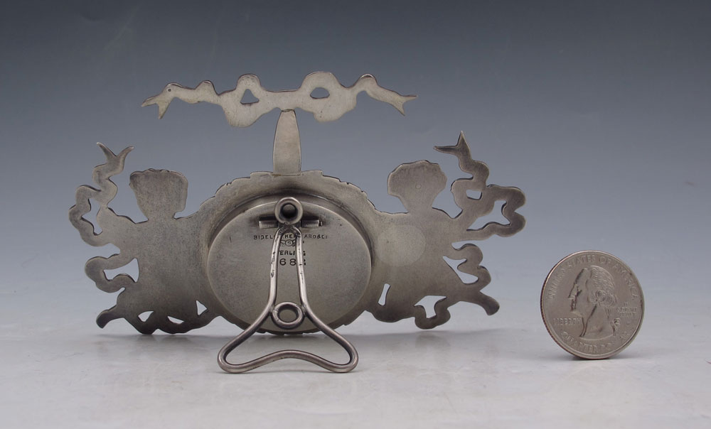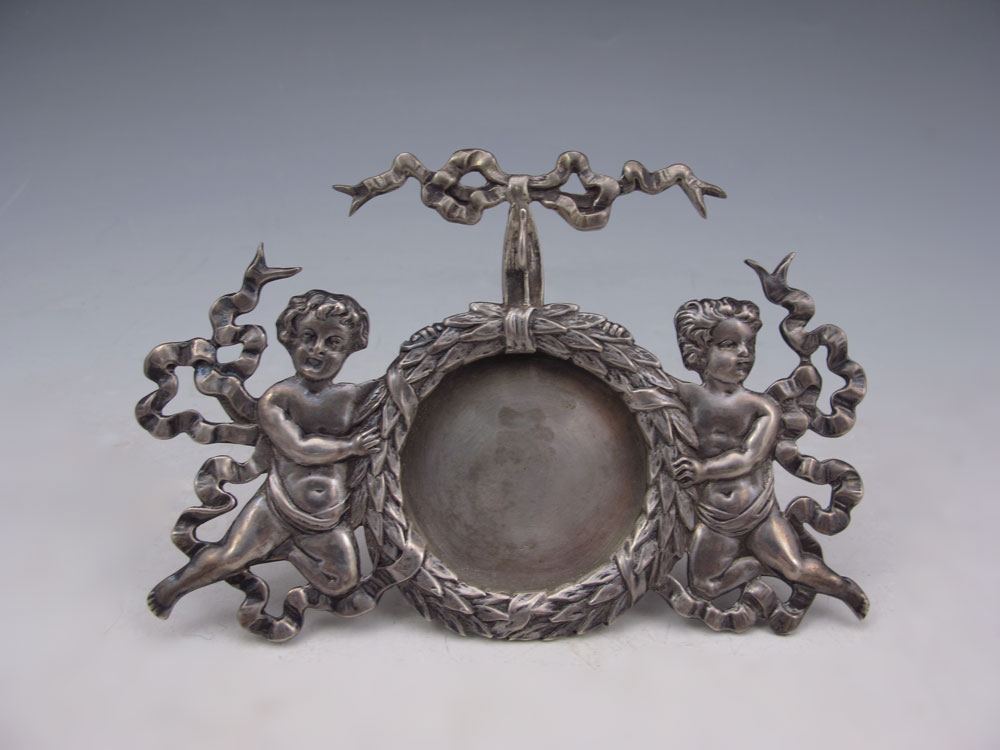 SHIEBLER STERLING PUTTI WATCH STAND: Featuring putti, wreath and ribbon design. Well marked with Shiebler mark, 4682, retailed by Bigelow, Kennard & Co.. 3'' x 4 1/2''. Approx. 1.8 troy oz.