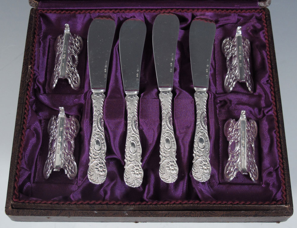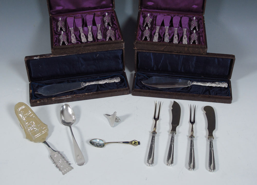COLLECTION OF SWEDISH STERLING BUTTER KNIVES & MORE: To include 1) Set of 8 butter knives (5 1/2'') and knife rests (1 7/8'' l.), 1946 Swedish date mark, unknown maker M.A.B. In faux leather presentation cases. 2) 2 fish knives (8 7/8''), 1946 Swedish, unknown maker M.A.B. In faux leather presentation cases. 3) Wilhelm Binder German 800 silver handle 4 piece set, 2 forks (7 7/8''), fish knife (7 3/4''), butter knife (7 3/4''). In presentation case. 4) 1946 engraved Swedish silver pie server, unknown maker COP, marked Bolidensilver, 8 5/8''. 5) Crosy & Ross Sterling tablespoon, monogrammed, 7''. 6) American sterling pusher, 1 1/4'' bent over. 7) German 800 silver Stuttgart spoon. Approx. 22.2 troy oz.