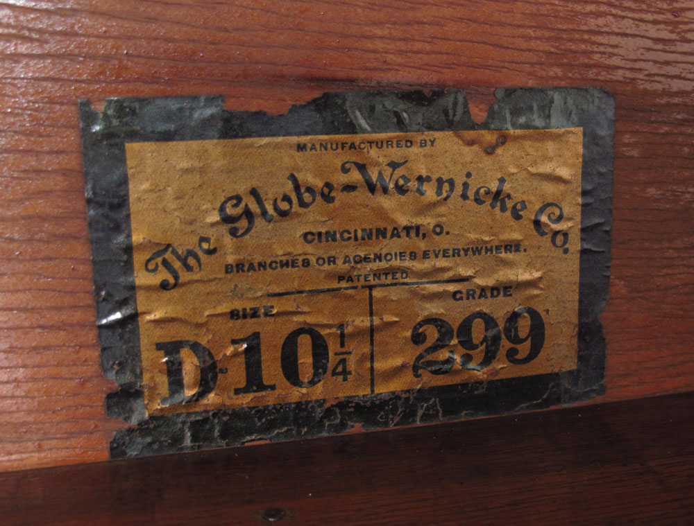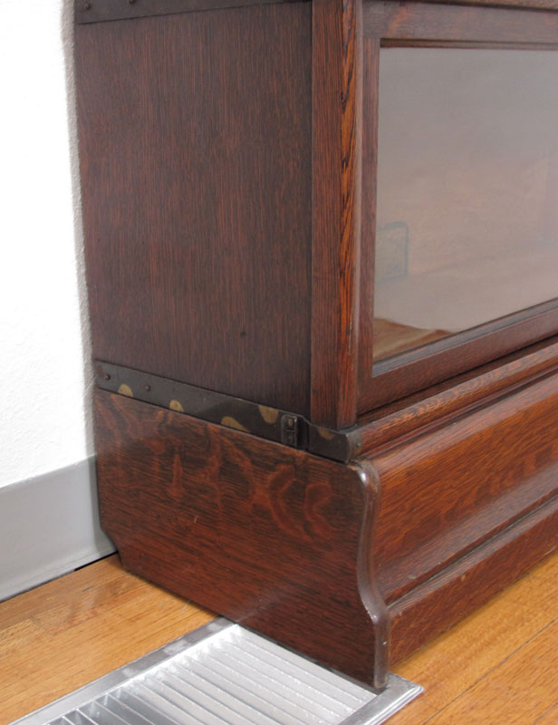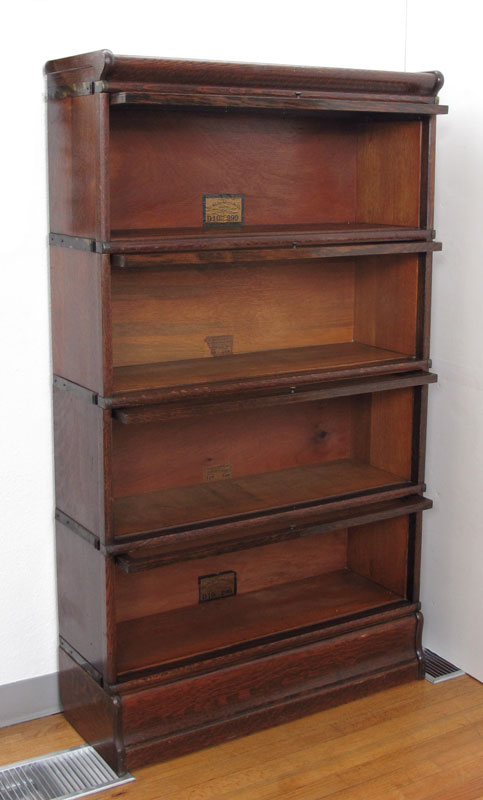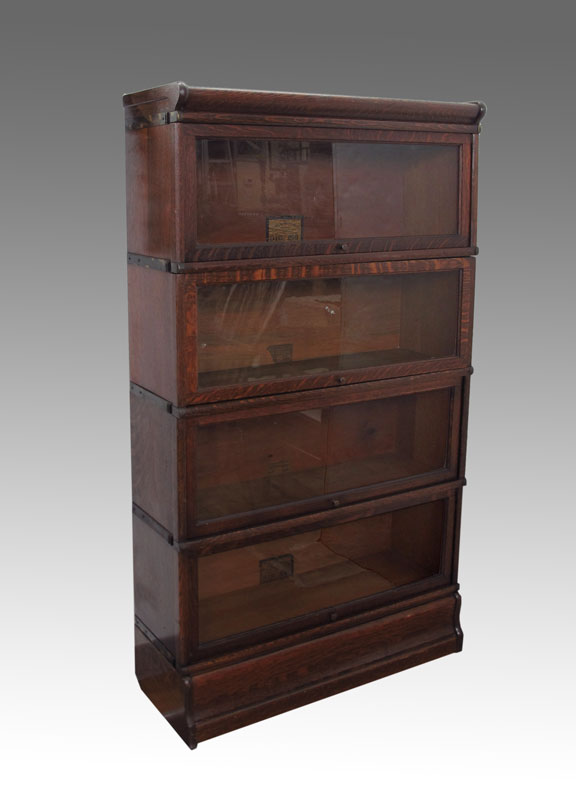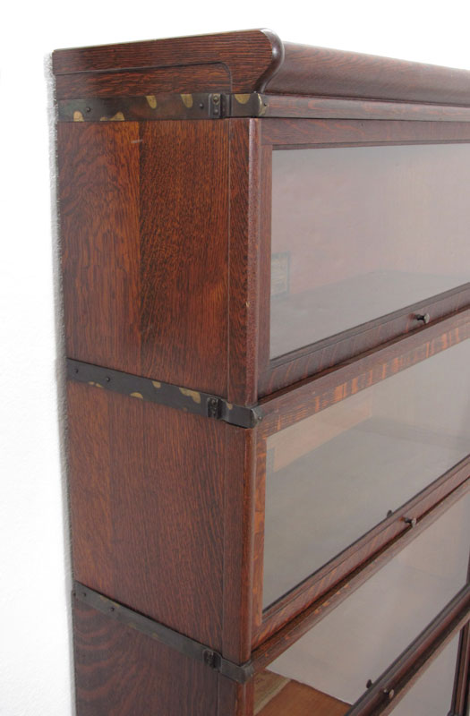 OAK GLOBE WERNICKE 4 STACK BARRISTER BOOKCASE: Quarter sawn oak 4 stack bookcase with metal side bands. Approx. 5 ft tall x 34''w. x 12'' deep.