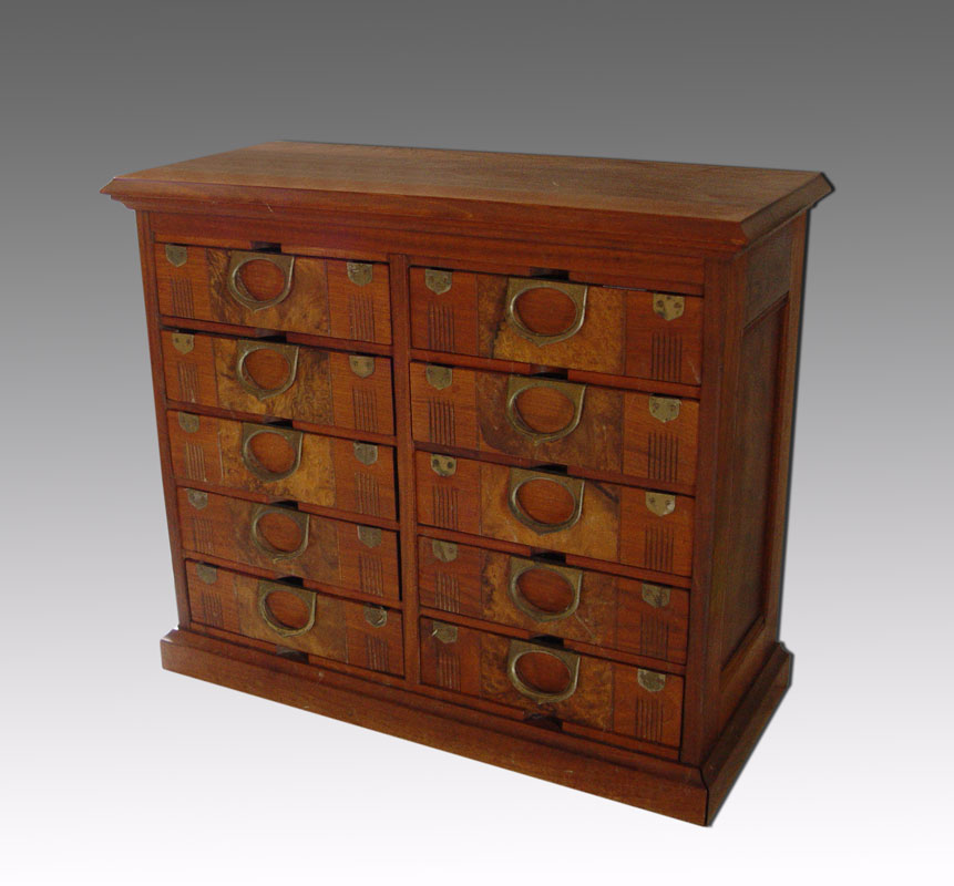 A WALNUT VICTORIAN 10 DRAWER FILE CABINET: Used by the Chief psychiatrist Fergus Falls State Hospital. 25 3/4''h. x 25 1/4''w. x 13 1/4''d.