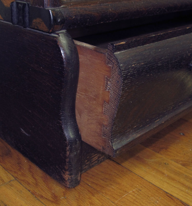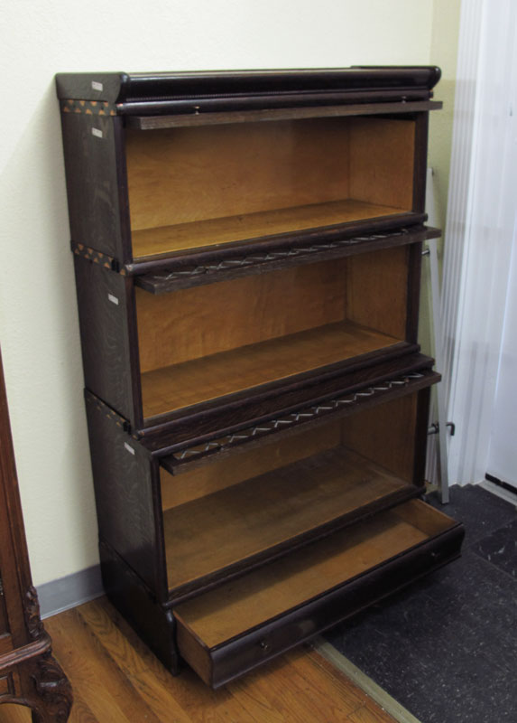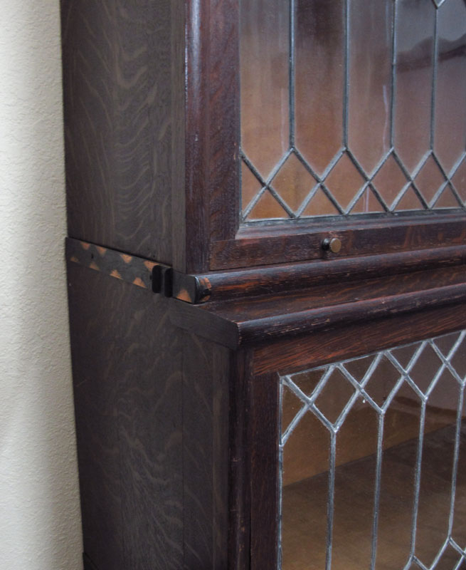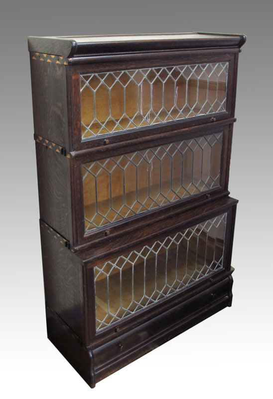 OAK LEADED GLASS 3 STACK BARRISTER BOOKCASE: 3 stack, bottom stack being 14'' deep, upper two section 11'' deep. Full length across bottom. 53'' tall x 34'' wide overall.