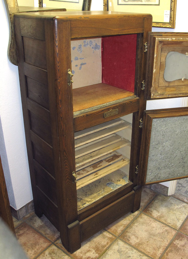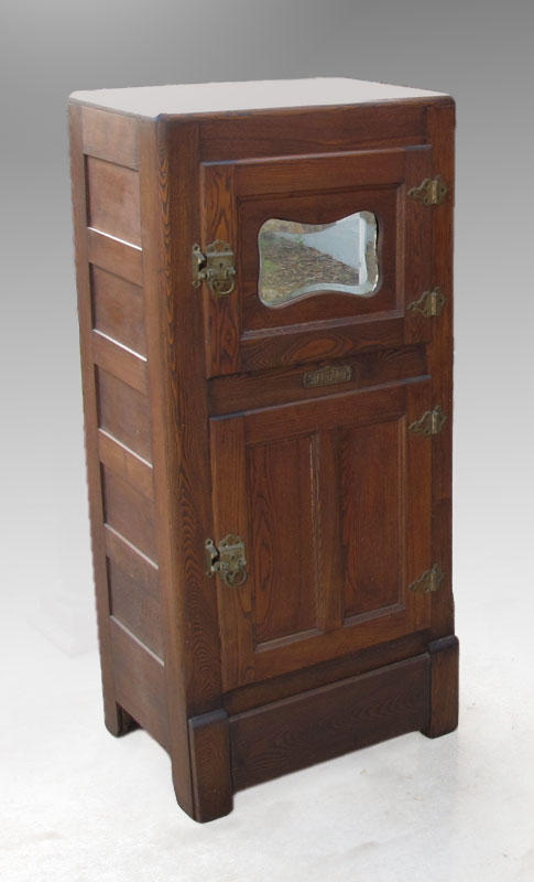 STANDARD GOLDEN OAK ICE CHEST WITH MIRROR: 2 door ice chest with beveled mirror on top door. Original hardware and ''Standard'' plaque. 55 1/4'' h. x 25'' x 19 1/2''.