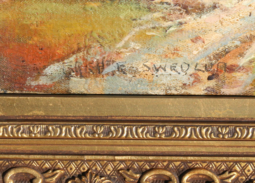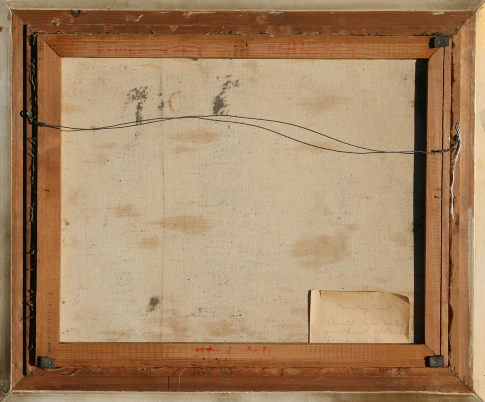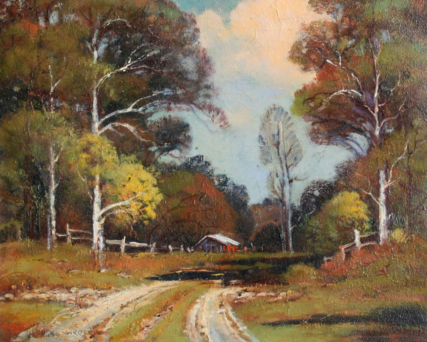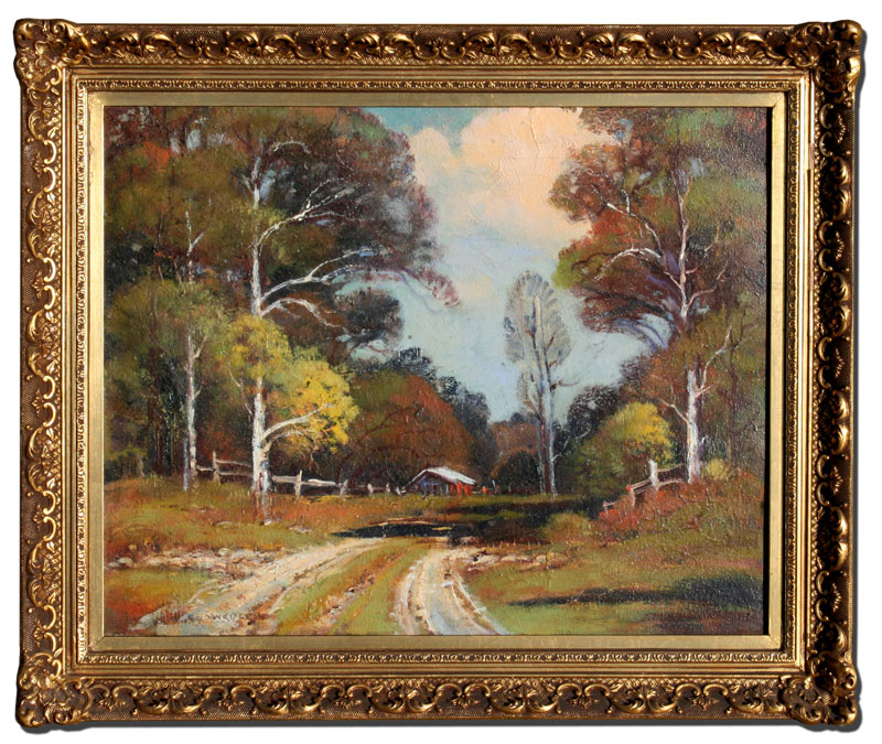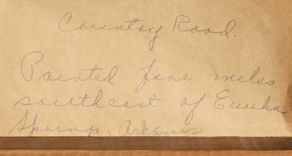 SWEDLUN, Fred, (ERNEST FREDERICKS), (American, 1877-1959): ''Country Road'', painted five miles Southeast of Eureka Springs, Arkansas, OIL/Canvas, 16'' x 20'', signed, label verso, carved and gilded frame with wear, 21'' x 24'', original label verso.