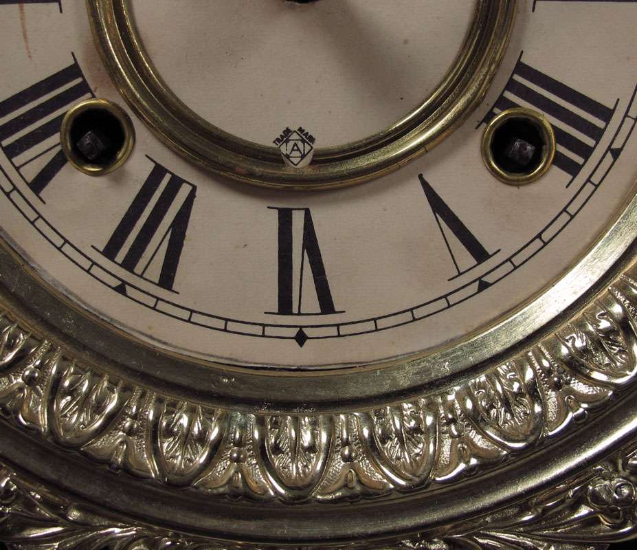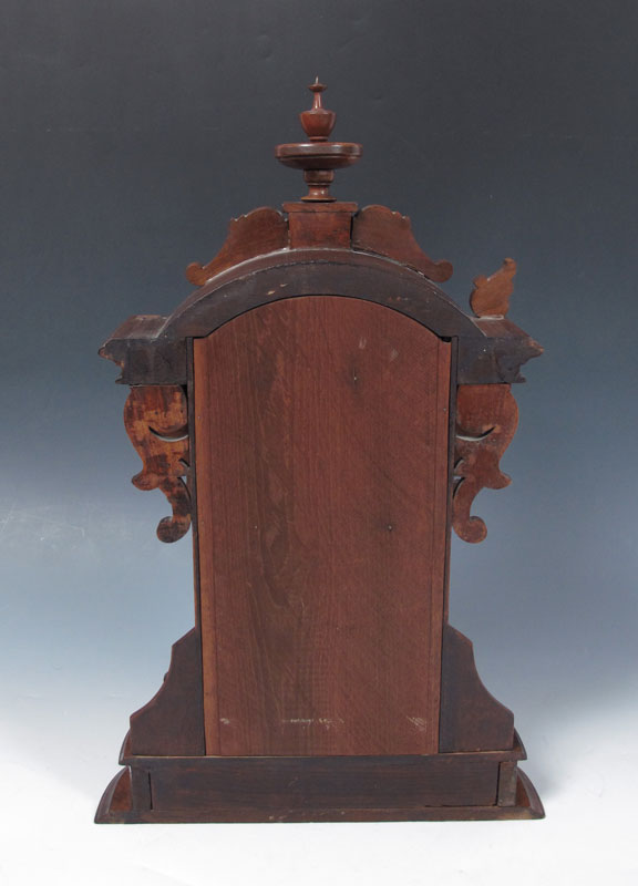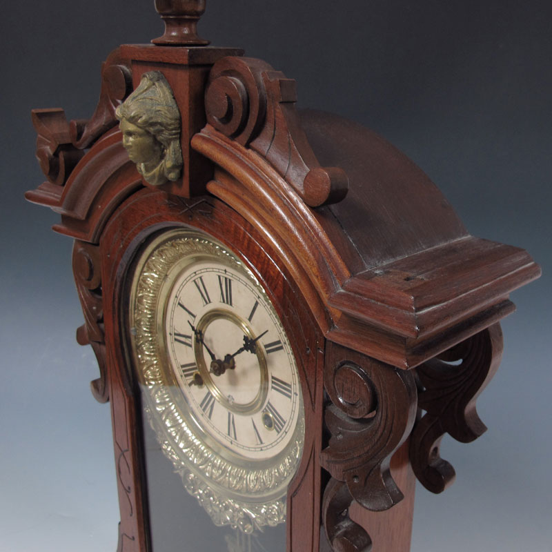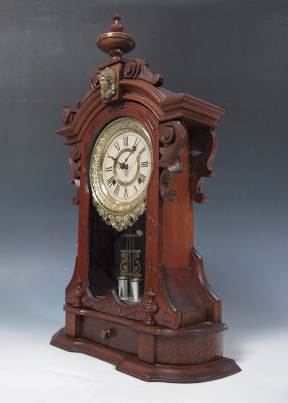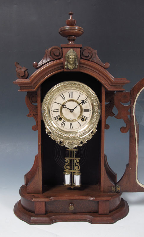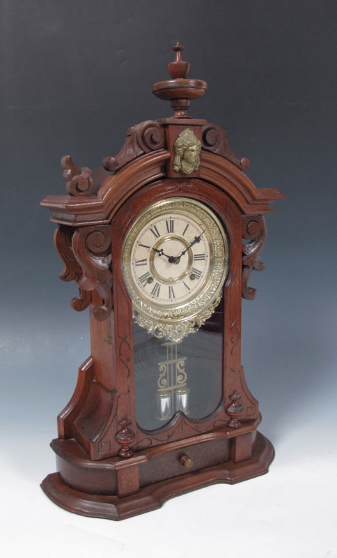 ANSONIA MONARCH BURL WALNUT MANTLE CLOCK: Walnut and burl walnut carved and shaped case with cast metal masqueron decoration. 8 day time & strike with pendulum, key in office. Cast metal bezel, paper over metal dial with Ansonia mark. 24 1/2'' x 15 1/2'' x 5 1/4''