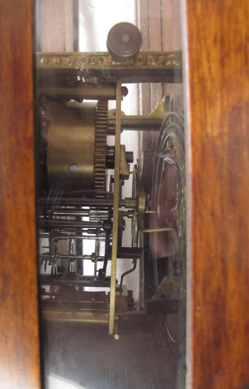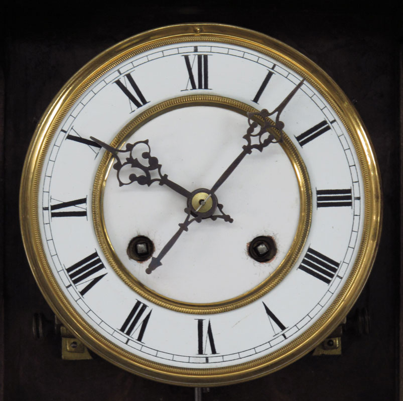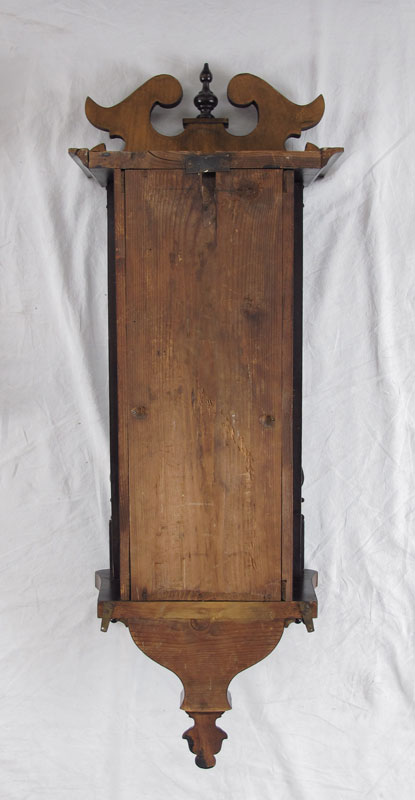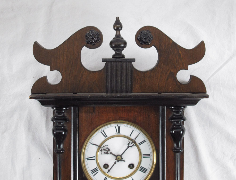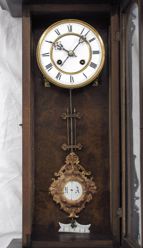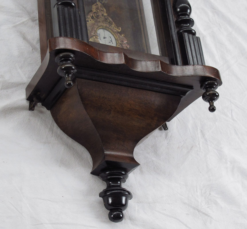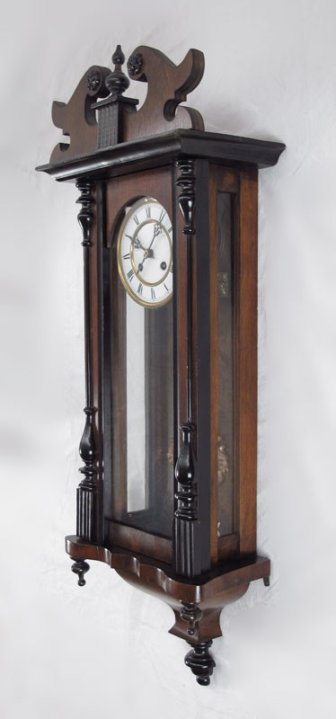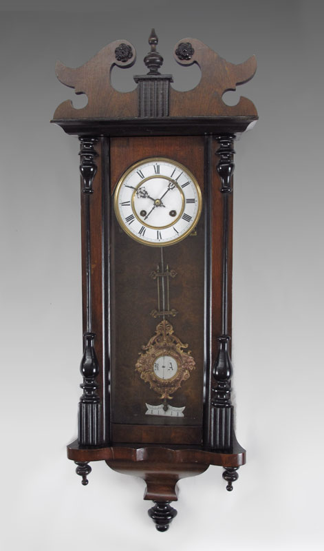 EUROPEAN REGULATOR WALL CLOCK: Most likely German walnut case with broken arch pediment, half columns, carved and turned finials. Glass on 3 sides. Key & R-A pendulum time and strike movement. 35'' x 12 1/2'' x 7''.