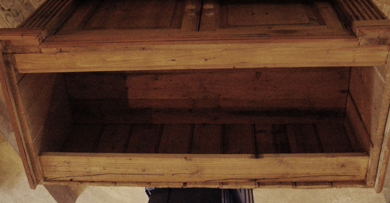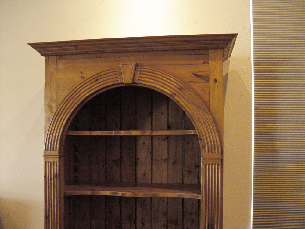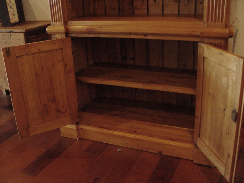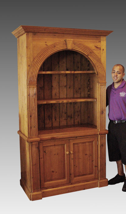 LARGE PINE DISPLAY CASE: Arched opening top with 2 adjustable serpentine shelves over 2 door base with interior shelf. 86'' h. x 46'' x 22 1/2''.