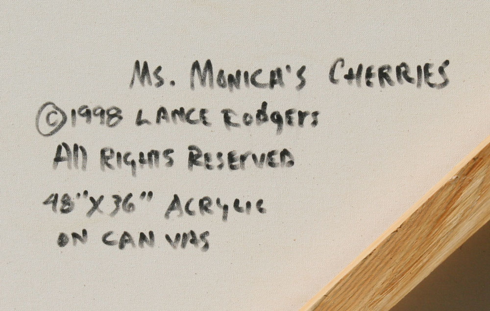 RODGERS, Lance, (American, 20th C.): ''Ms. Monica's Cherries'', ACRYLIC/Canvas, 48'' x 36'', signed and titled verso, dated 1998, framed, 50'' x 38''.