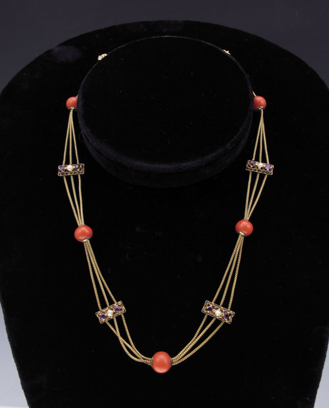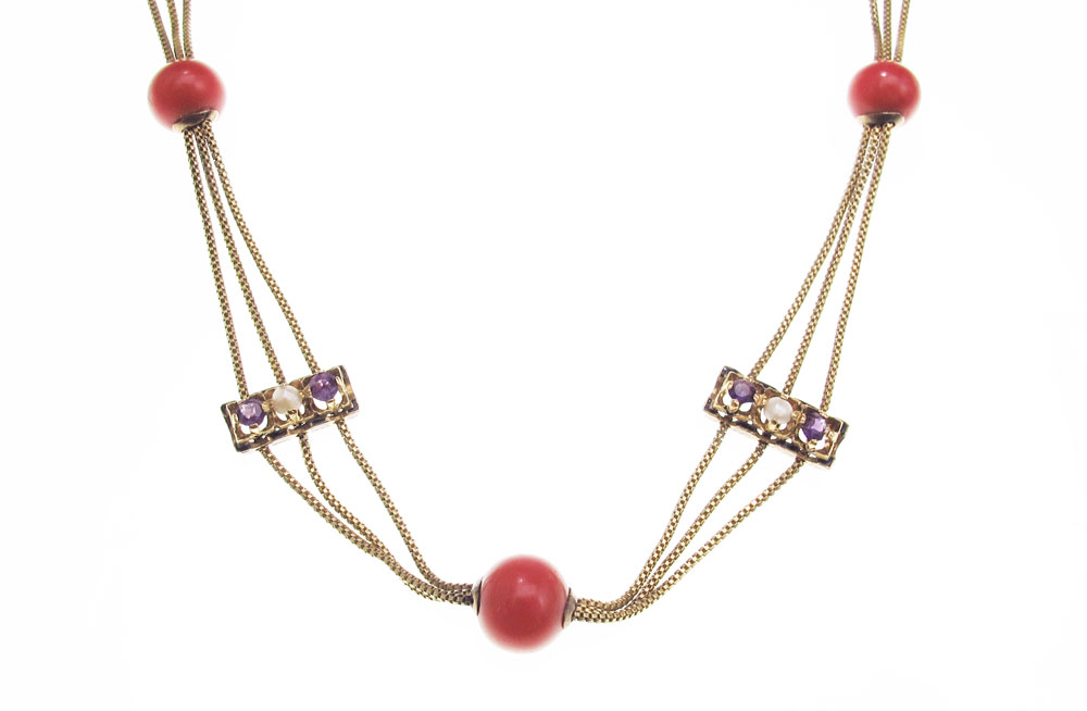 14K VICTORIAN NECKLACE: 14K yellow gold Victorian necklace with five 8.00 m coral slides and six slides containing amethyst and seed pearls. Triple strand snake chain. Approx. 15'' in length. Black enamel decoration on slides. Weight: 14.8 grams.