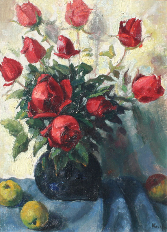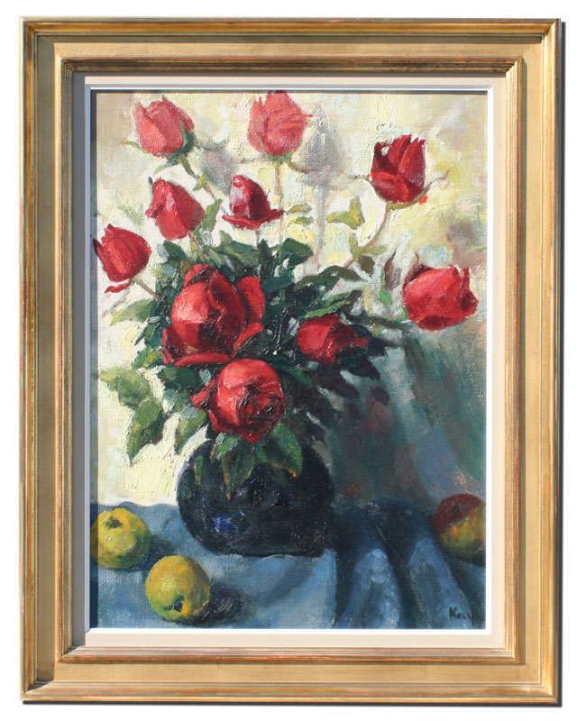 KAVEL, Francois, (French, 20th C): Floral Still Life of Roses in a Vase with Apples on a Cloth, OIL/Canvas, 28 3/4'' x 21 1/4'', signed, fine gilded gesso frame, 35 1/2'' x 28''.