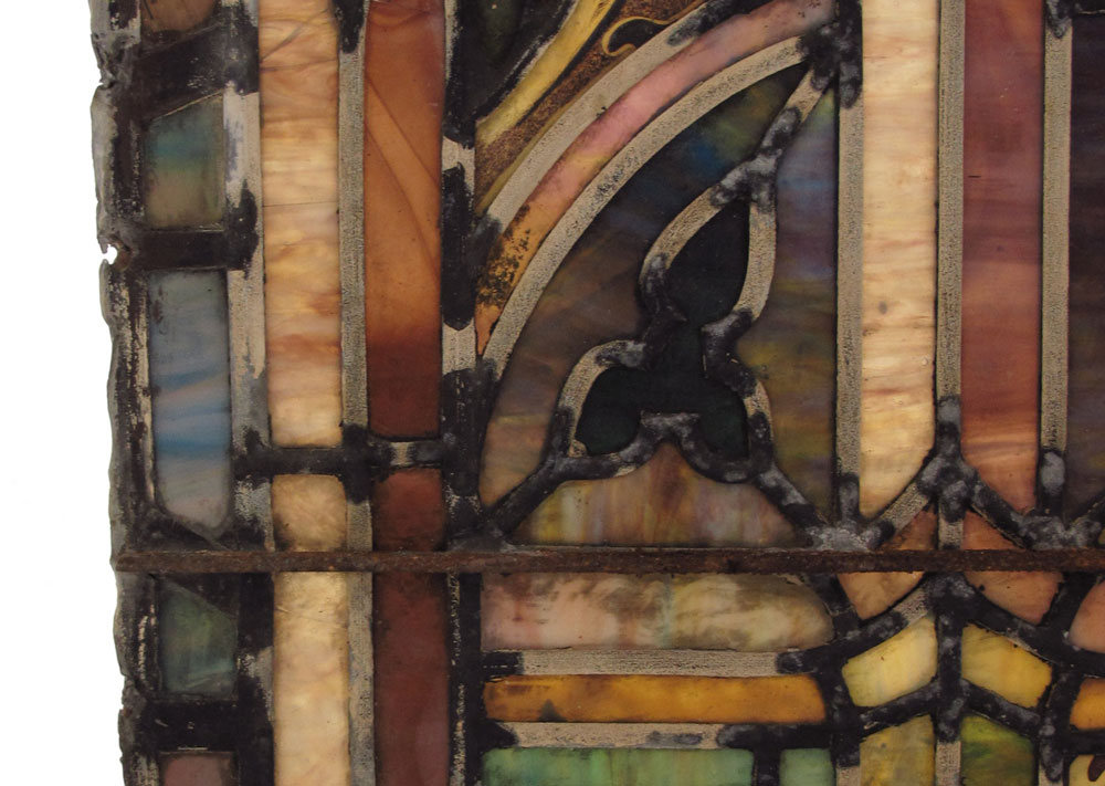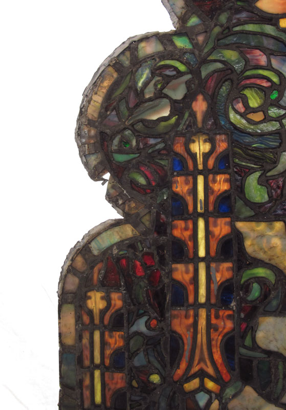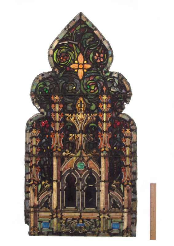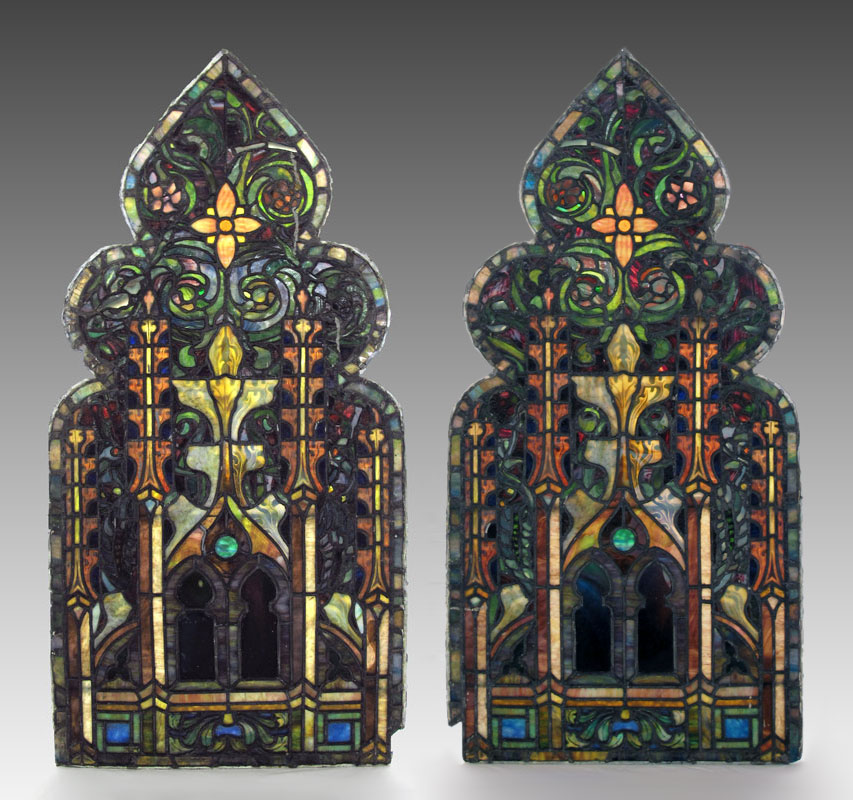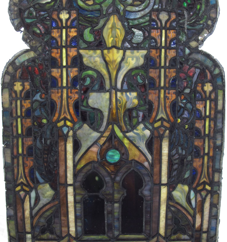 PAIR ARCHITECTURAL STAINED GLASS WINDOWS: Salvaged from a church in Tarpon Springs, Florida. Measure 49'' x 24''.