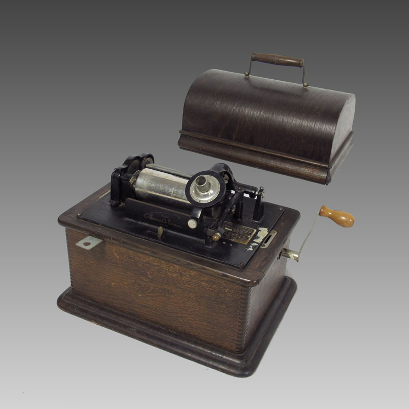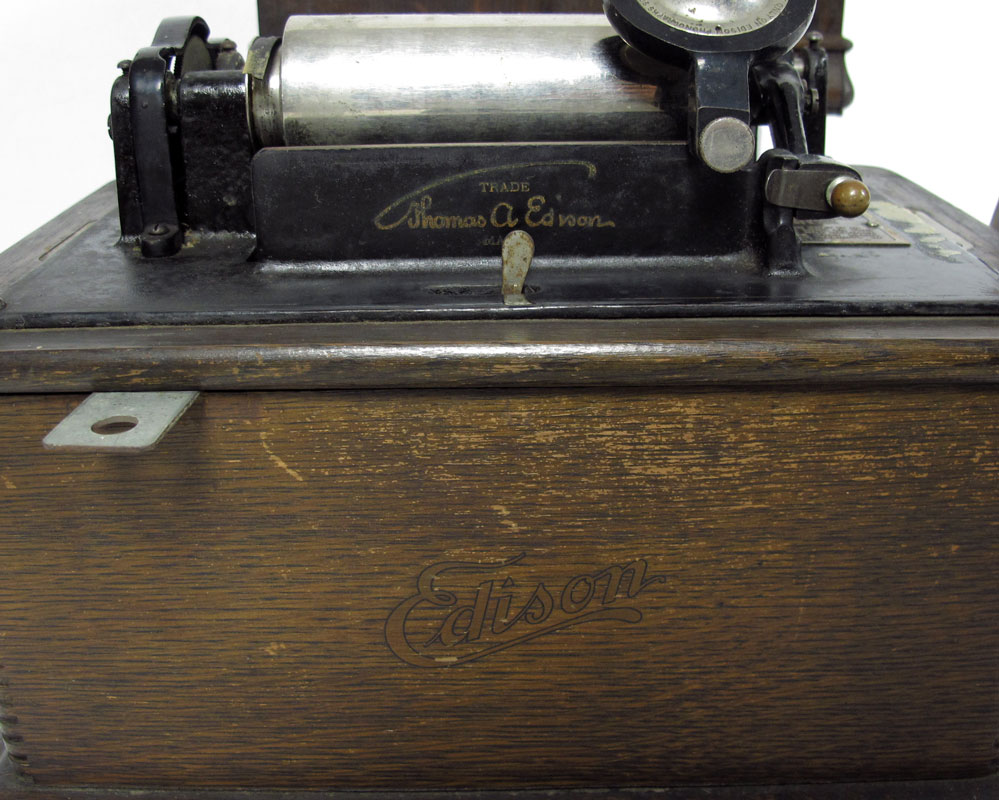EDISON STANDARD CYLINDER ROLL PHONOGRAPH: Serial number 586958 with last patent date of 1905. Currently cranks and rolls fine, cannot guarantee to continue. Original Edison label. 12 1/2'' h. x 13 1/8'' x 9 5/8''.