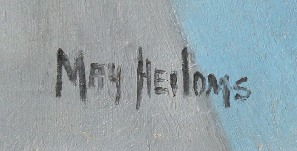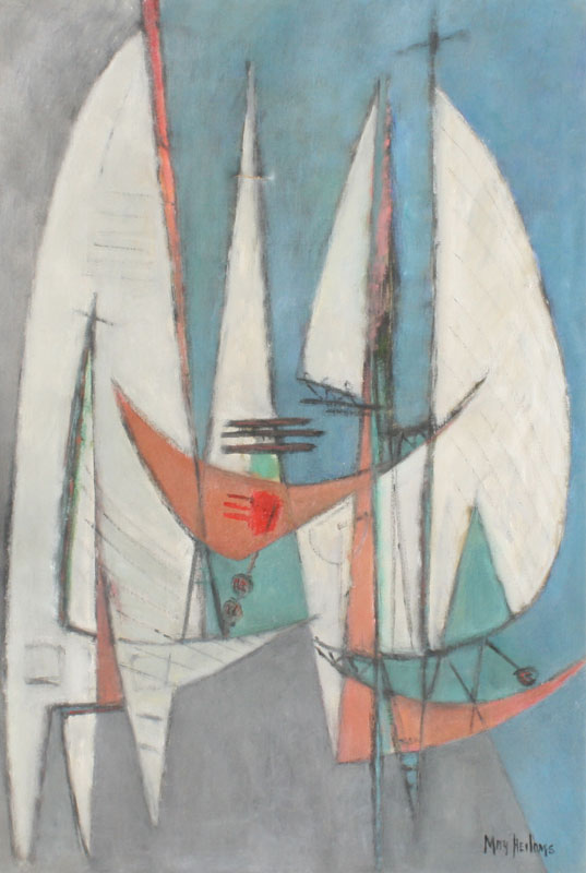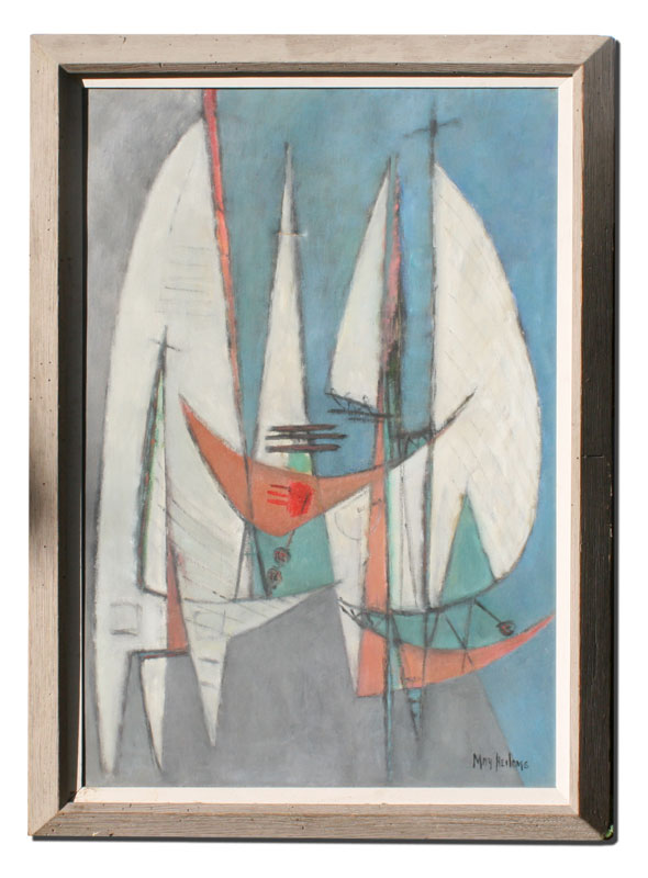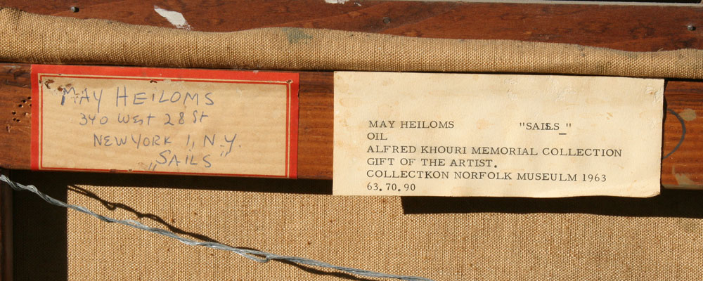 HEILOMS, May, (American, 20th C.): ''Sailes'', OIL/Canvas, 44'' x 30'', signed, museum collection inventory number on the frame and on the stretcher as well as the affixed label, Alfred Khouri memorial collection, gift of the artist, collection Norfolk Museum, 1963, distressed wood frame, 50'' x 36''.