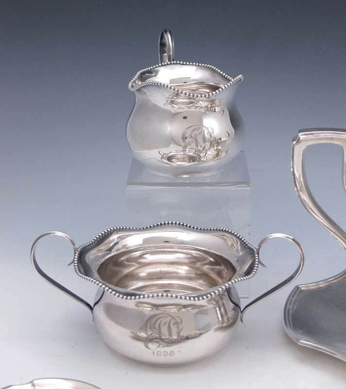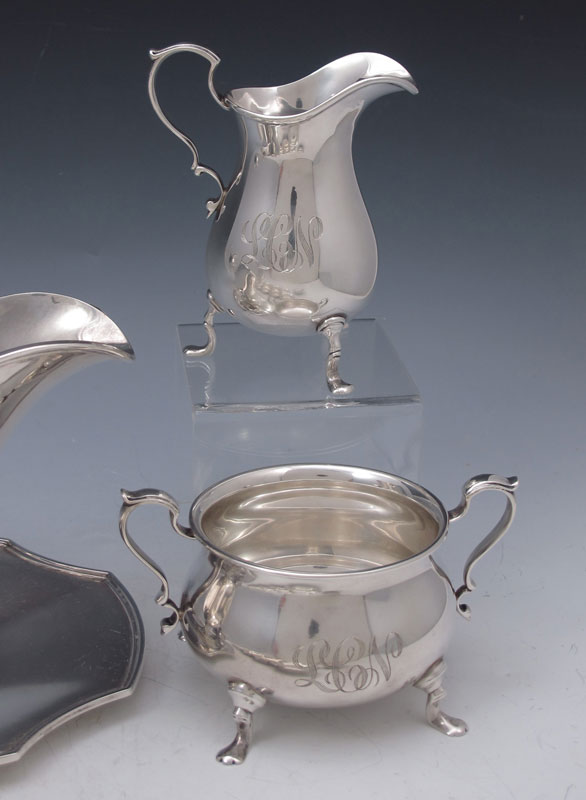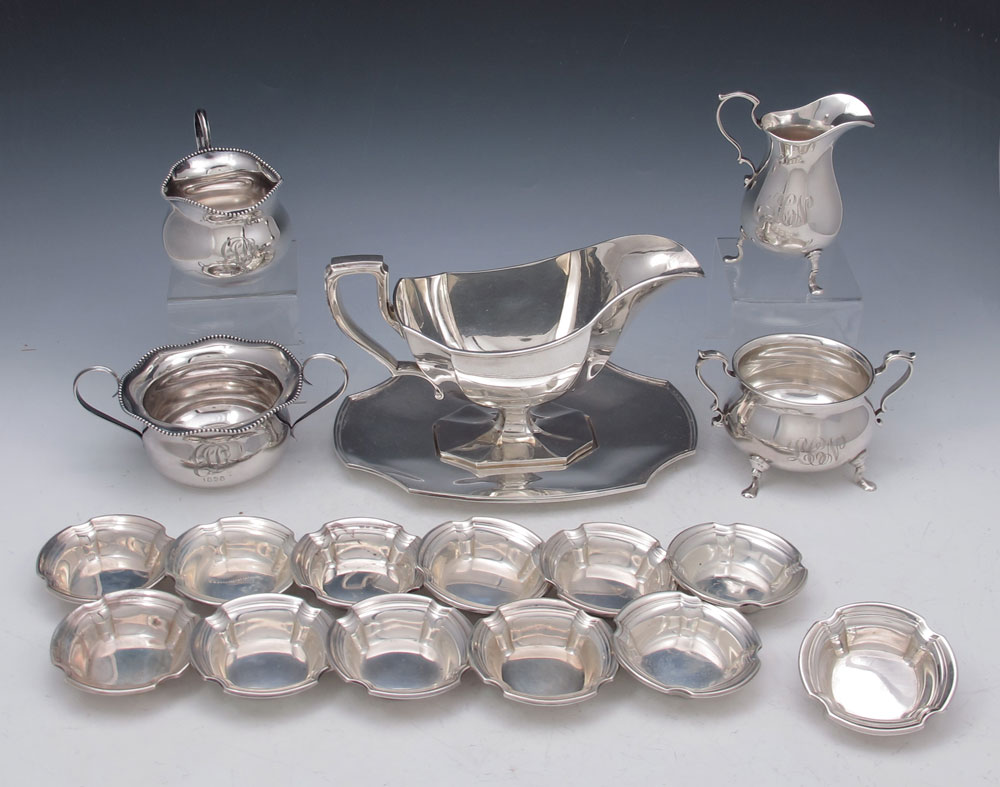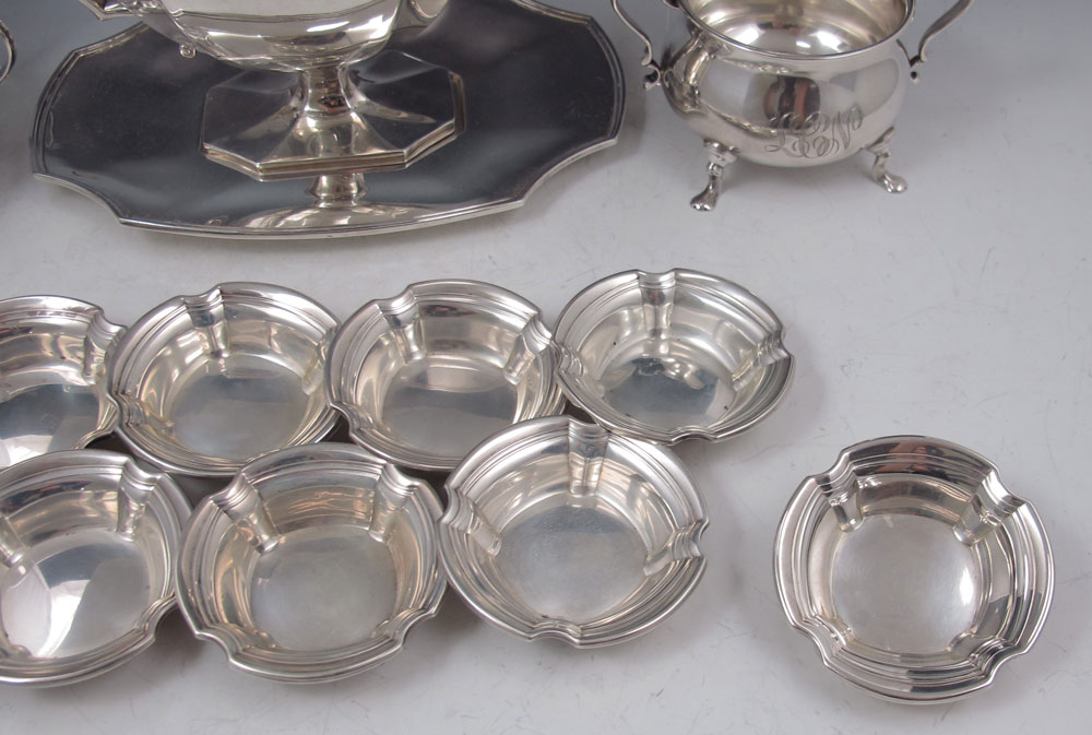 18 PIECE ESTATE STERLING COLLECTION: To include 1) Reed & Barton gravy boat 4 7/8'' h. x 8 1/4'', underplate 8 1/2'' x 5 7/8''. 2) Baltimore Silver Co. open cream 3 1/4'' x 4 3/4'' and sugar 2 1/4'' x 6'' retailed by Bunde & Upmeyer. Monogrammed and dated 1898. 3) Richard Dimes footed open cream 4'' x 3 1/2'' and sugar 2 3/4'' x 4 7/8''. Monogrammed. 4) 12 Whiting nut dishes 2 3/4'' dia.. Approx. 34.9 troy oz.