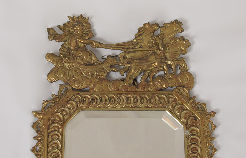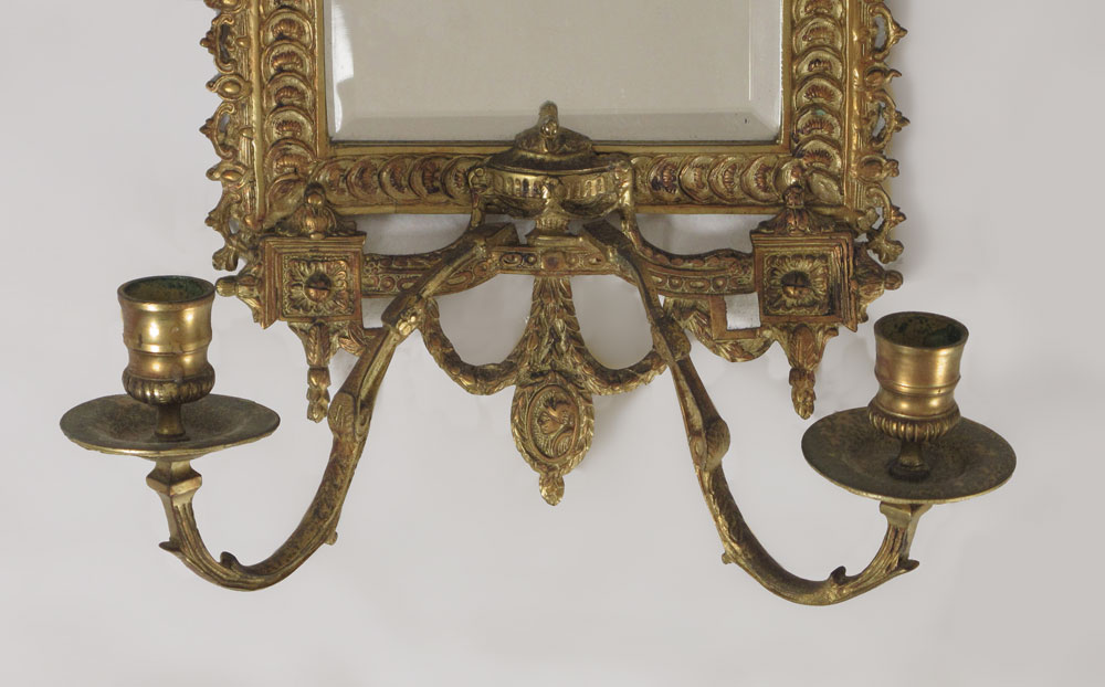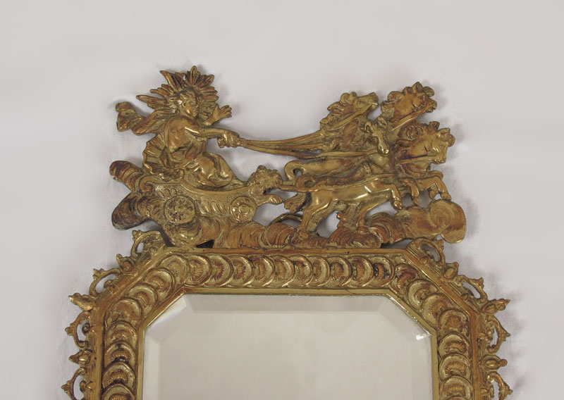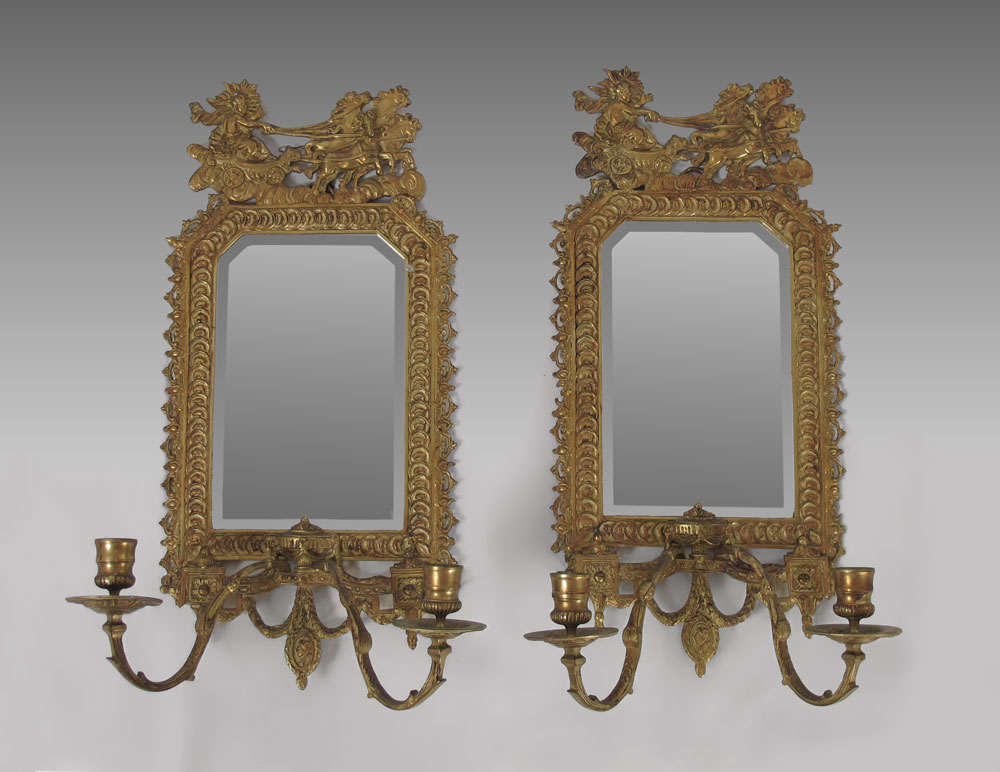 PAIR EARLY GILT METAL MIRRORED WALL SCONCES: 2 light sconces with Greek horse and chariot motif. Beveled glass mirror. 19'' h. x 9 3/4'' x 5 1/4''.