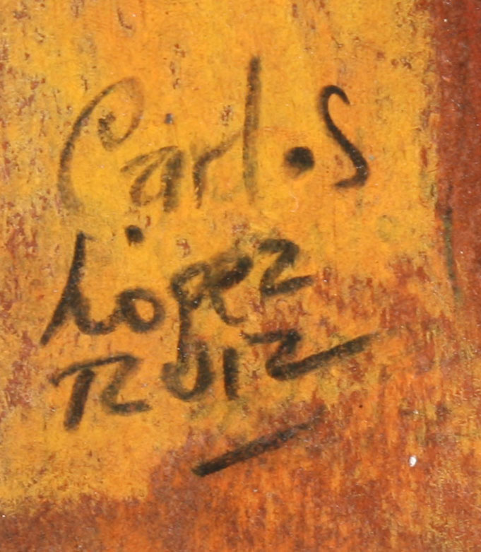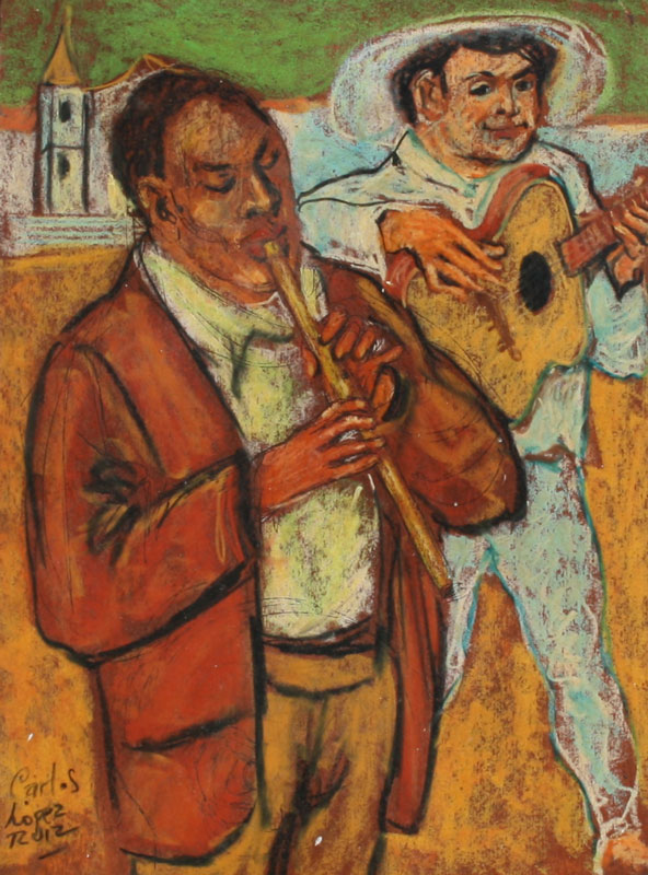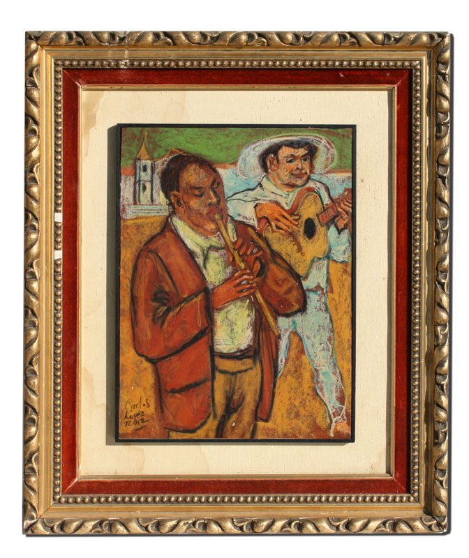 LOPEZ, Carlos S., (Colombian, Early 20th C.): Mexican Musicians, OIL/Board, 16'' x 12'', signed Carlos S. Lopez Ruiz, gilded frame with wear, 25 1/2'' x 21 1/2''.