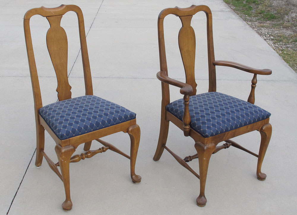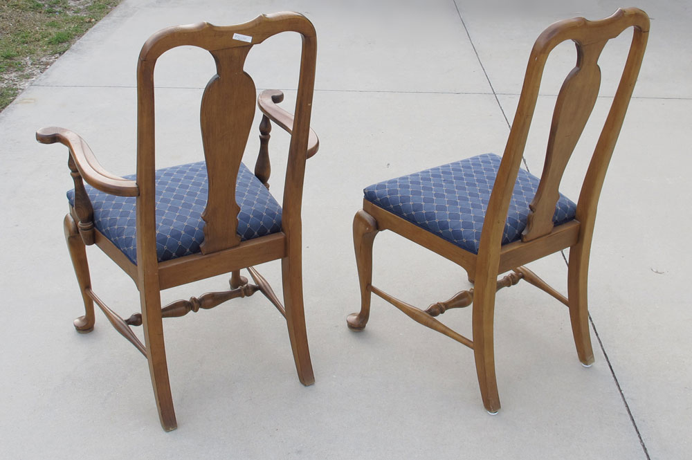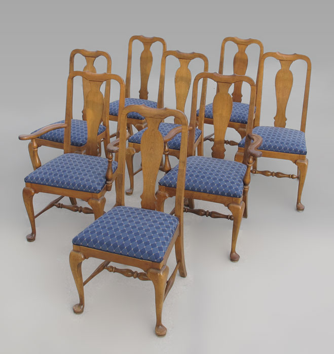 SET OF 8 ETHAN ALLEN QUEEN ANNE STYLE CHAIRS: Two arm chairs, six side chairs, signed Ethan Allen. Worn finish.