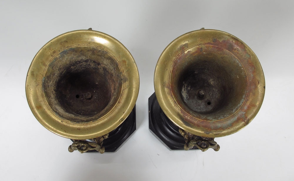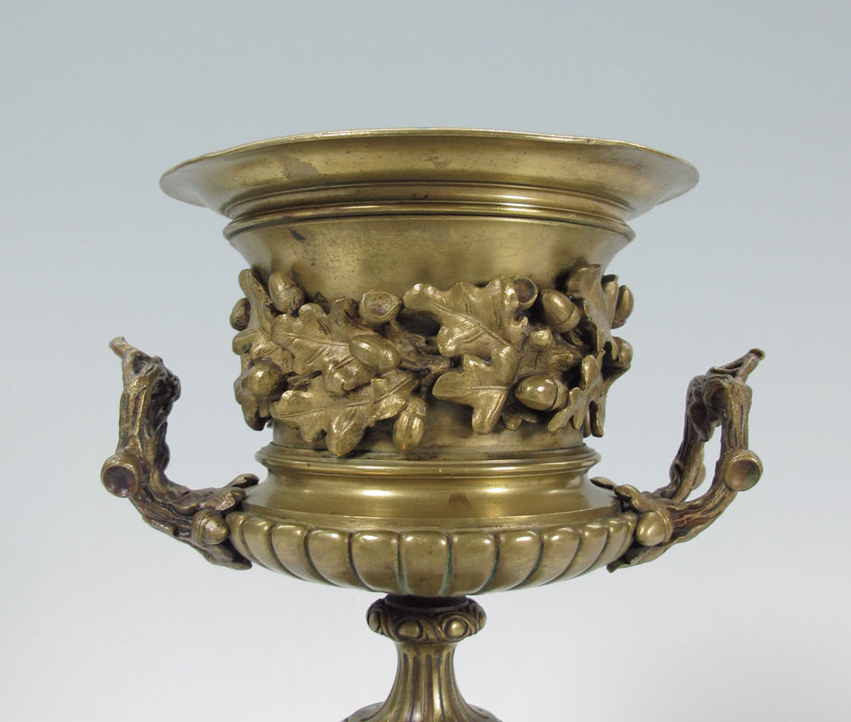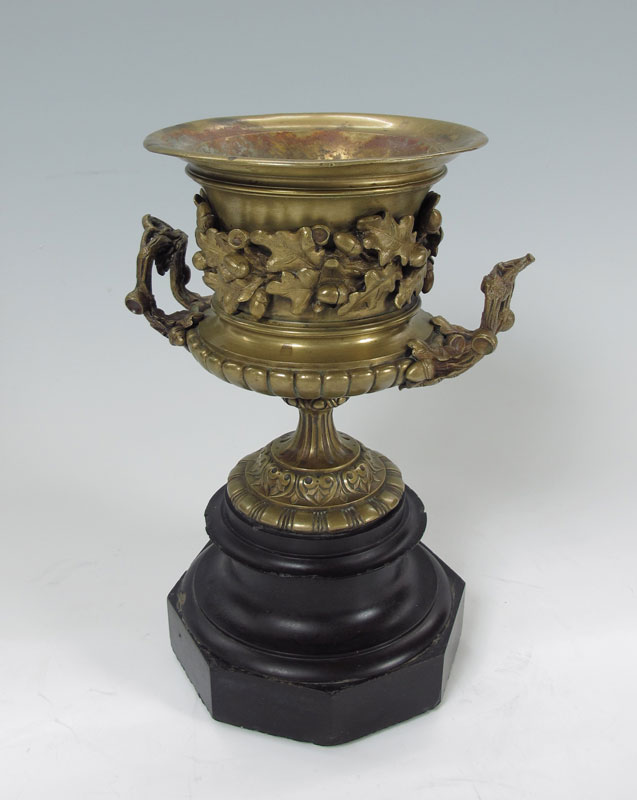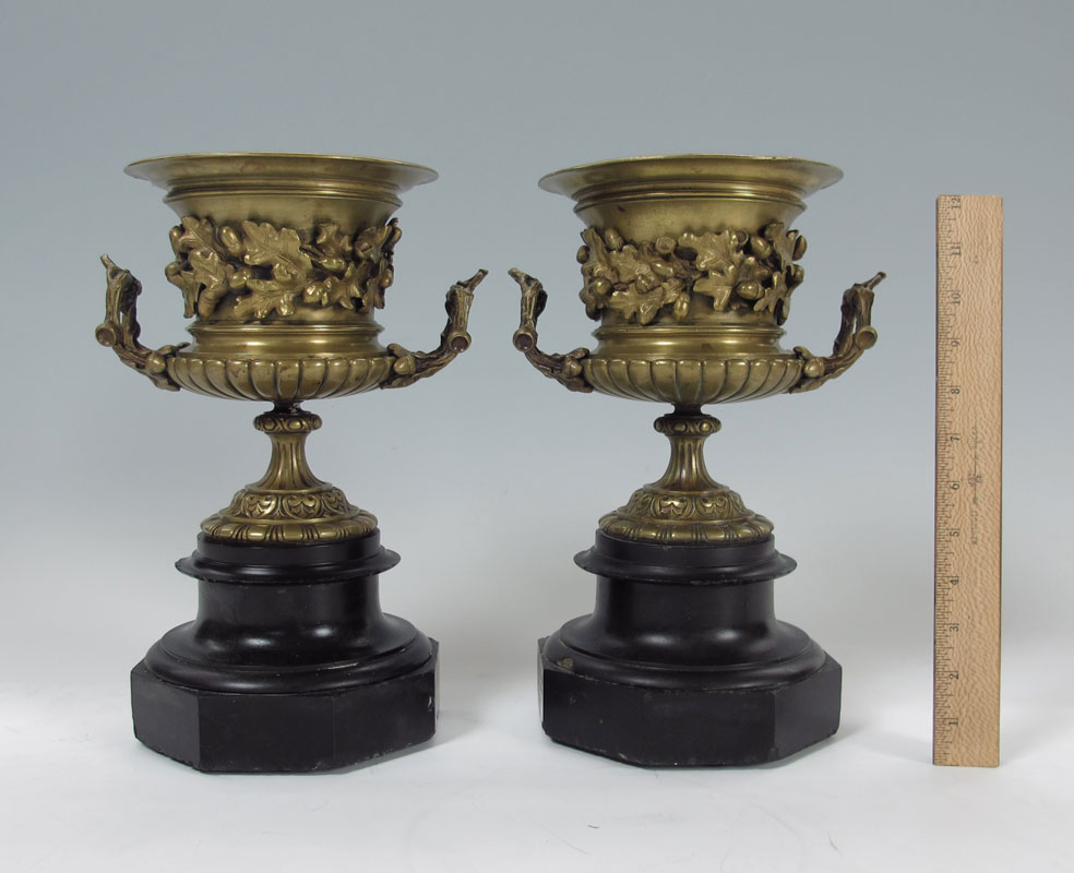 PAIR BRONZE URNS: The raised design of oak leaves and acorn follows through on the branch form handles. Please note there are small chips on the black stone plinths, wear to the interior. Approx. 12 5/8''h x 8 1/2''.