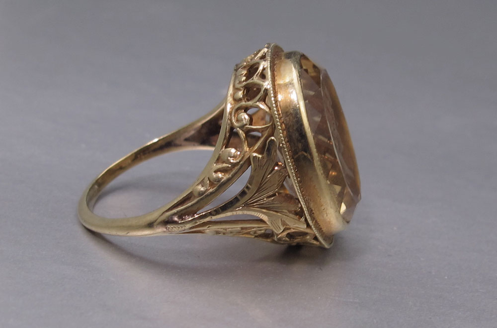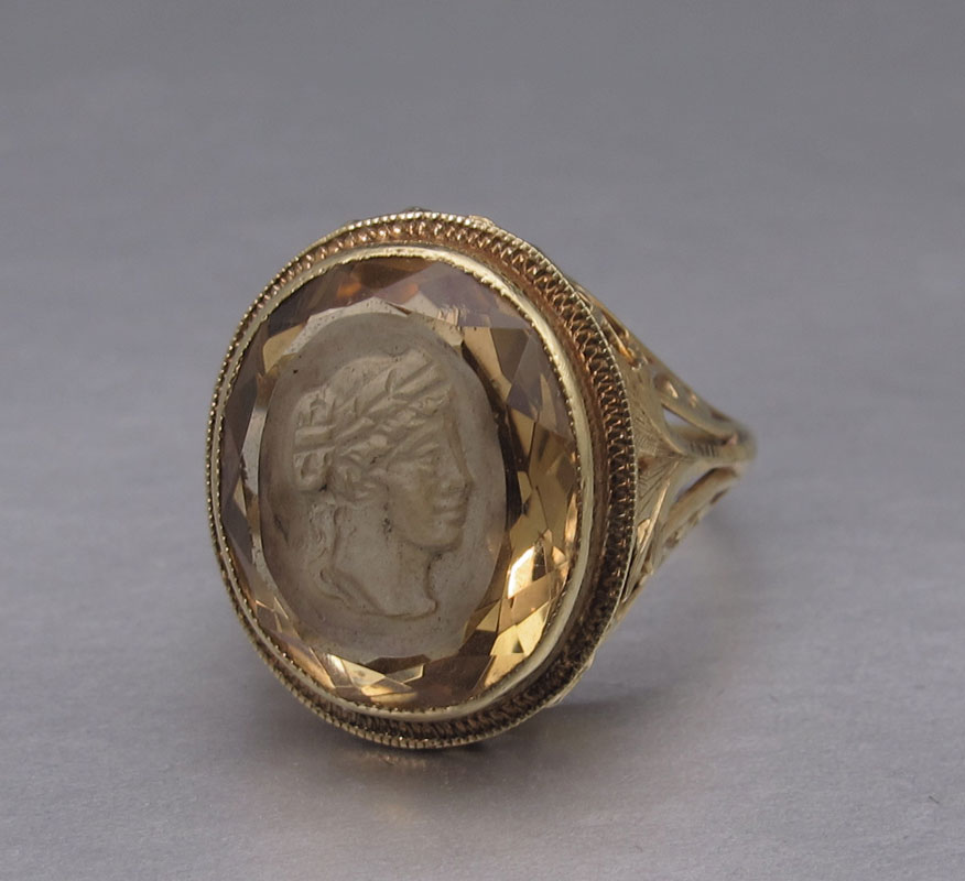 14K CITRINE INTAGLIO RING: 14K yellow gold ring contains one 15.00 x 12.00 mm oval shaped mixed cut citrine. Weight: 5.00 Ct. Approx. The citrine has a carved intaglio in the center depicting a Grecian profile. The citrine is bezel set. Filigree gallery. Weight: 4.5 grams. Size: 5