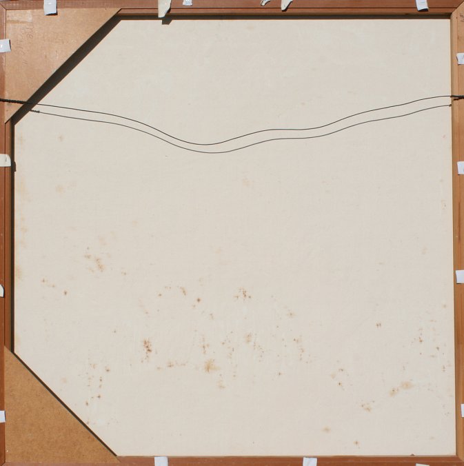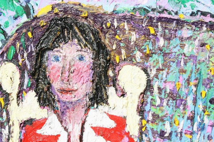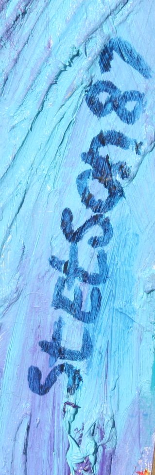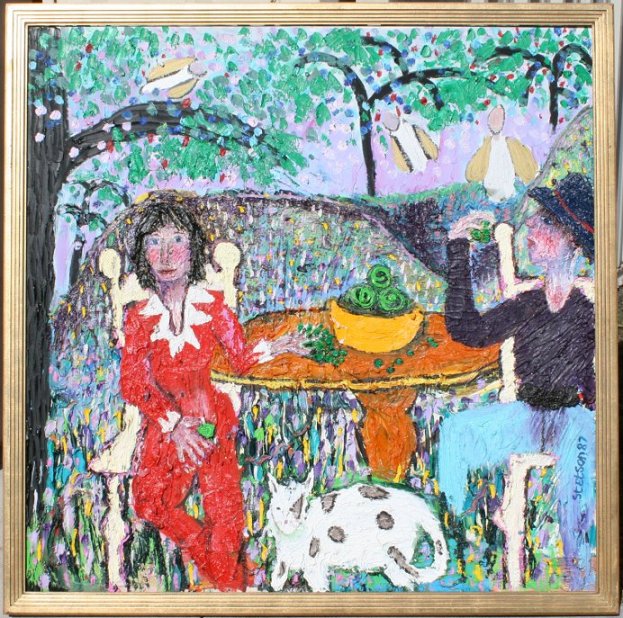 LARGE OUTSIDER ART STYLE PALETTE KNIFE PAINTING BY STETSON: ''The Picnic'', OIL/Canvas, 48'' x 48'', signed and dated 1987, gilded frame, 51'' x 51''. This painting won the Billings Montana Best of Show at Yellowstone Art Center in 1988.