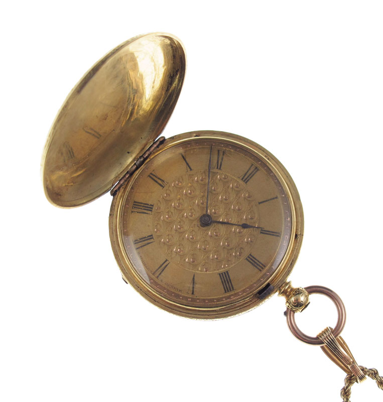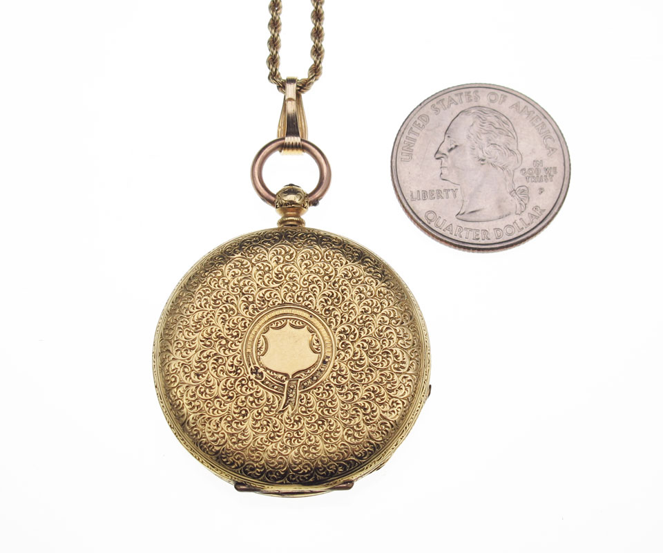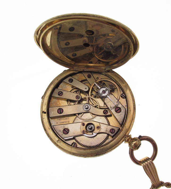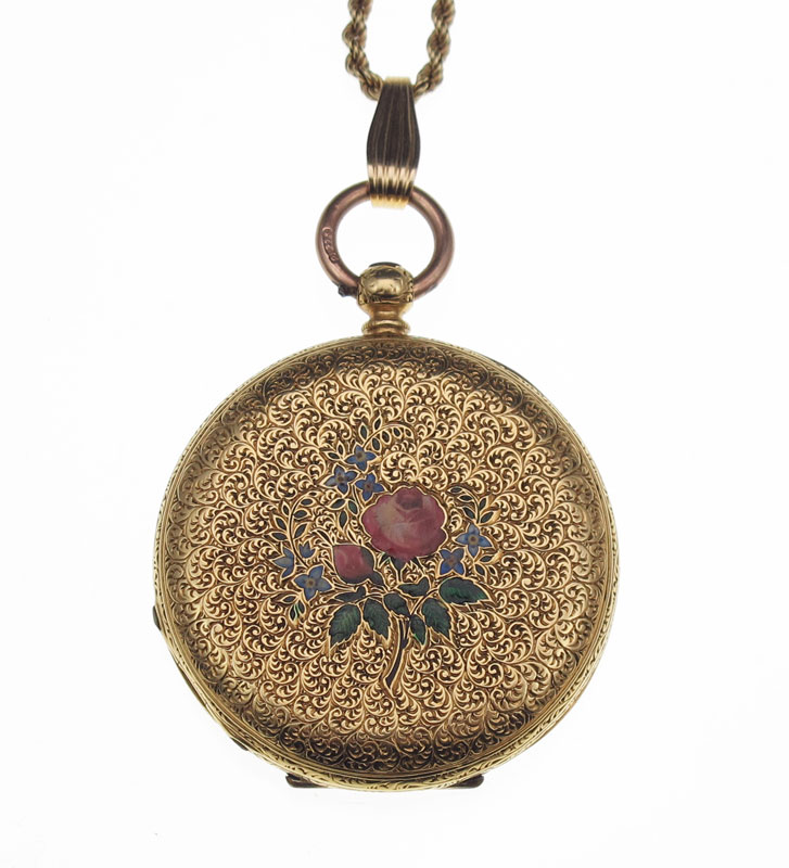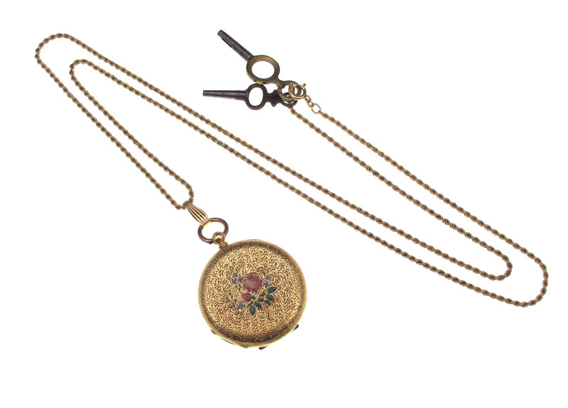 VICTORIAN 18K GOLD POCKET WATCH: 18K yellow gold hunter's case Swiss made key wind pocket watch with enameled rose on rear cover. The dial with a unique snail design and Roman numerals. Two antique keys, one for winding, one for setting time. A simple cleaning should put this watch in running order. The 18K chain is 30'', weighs approx. 13.8 grams.