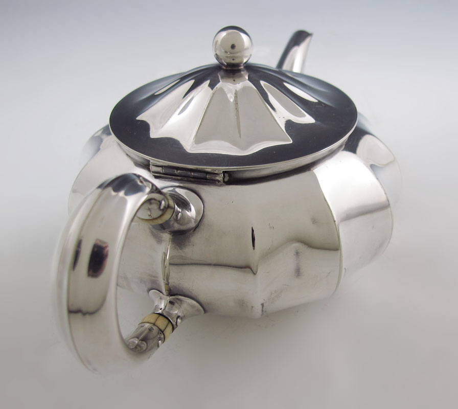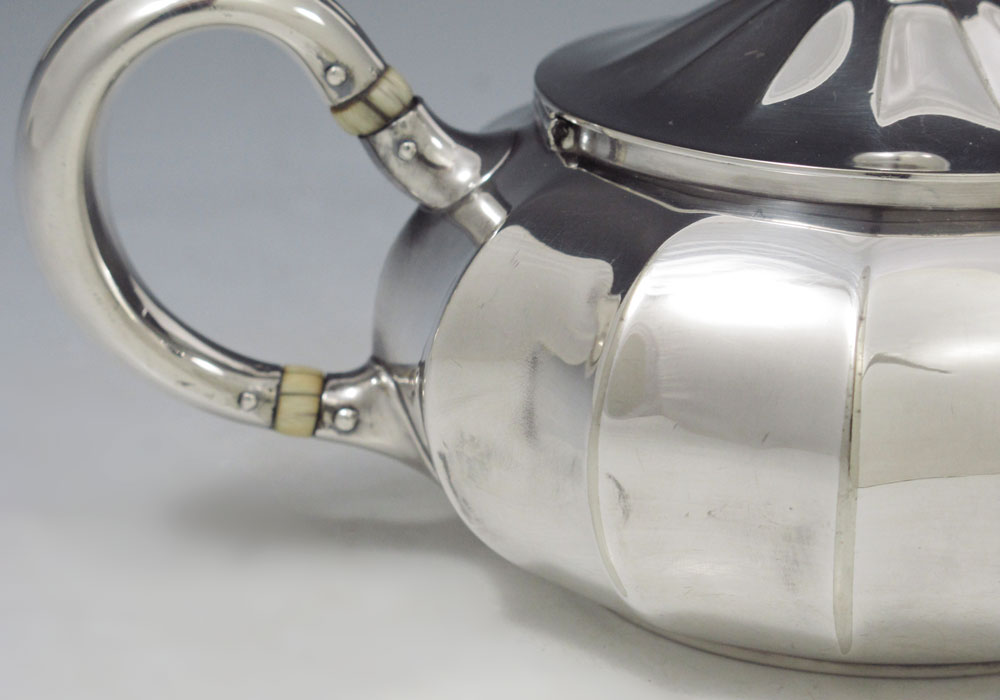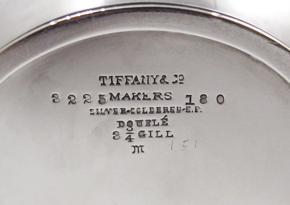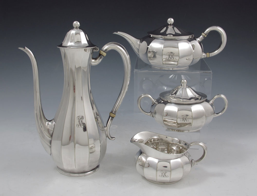 TIFFANY & CO. SILVER PLATE TEA SERVICE: 4 pieces by Tiffany & Co. to include coffee pot 8 1/4'' h. x 6'', tea pot 3'' x 8'', covered sugar 2 1/2'' x 5 1/2'', open creamer 2 1/8'' x 4 1/4''. All pieces monogrammed.