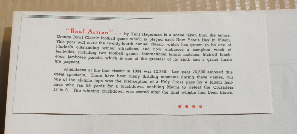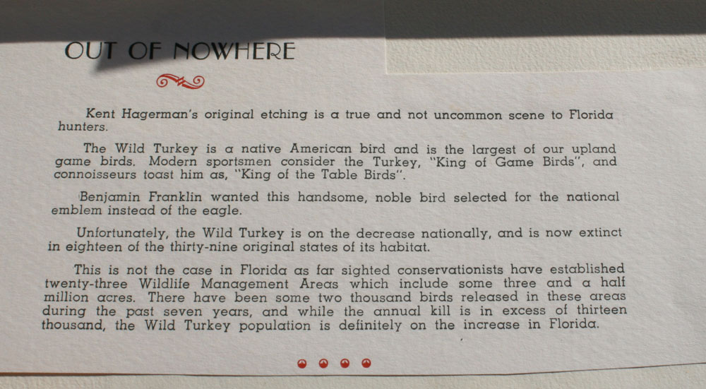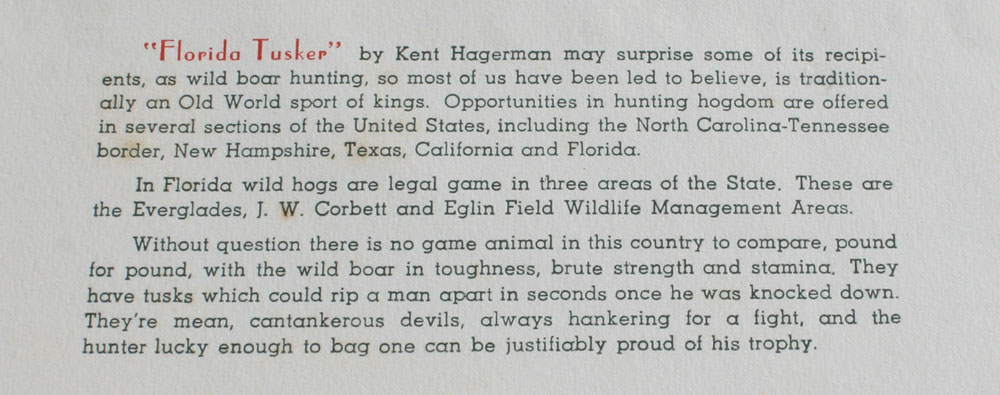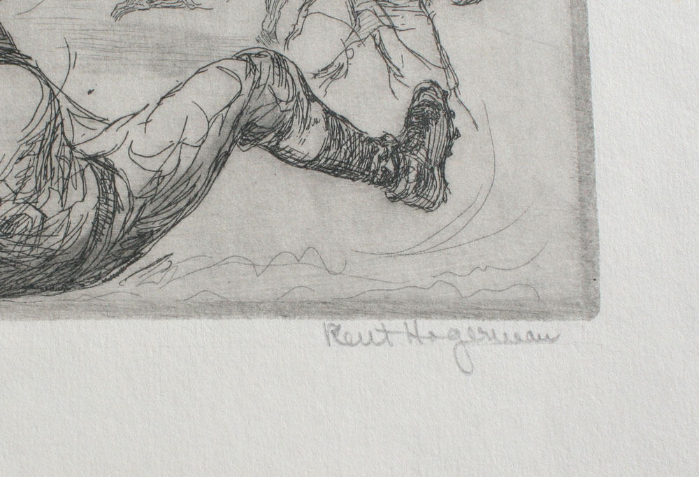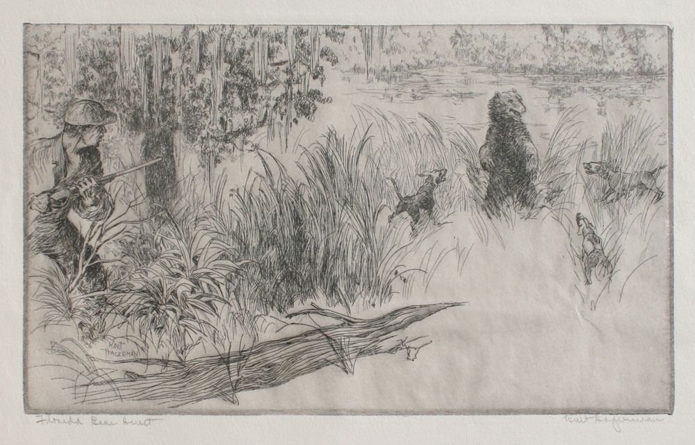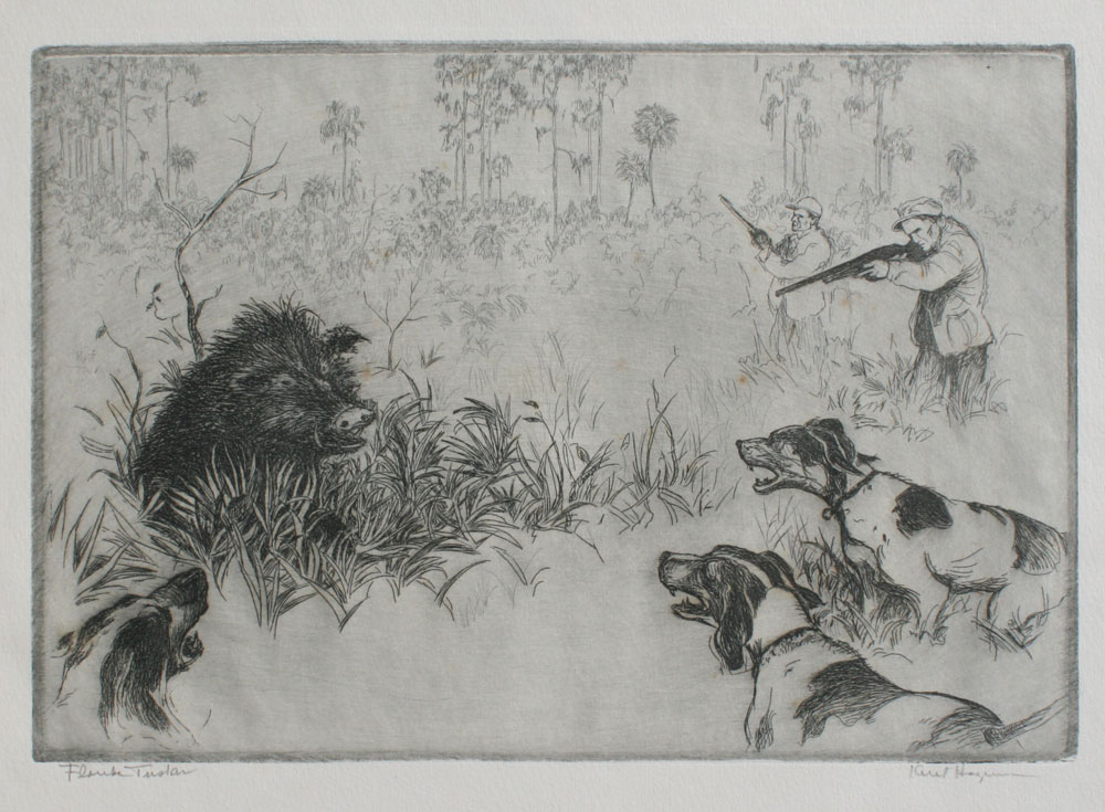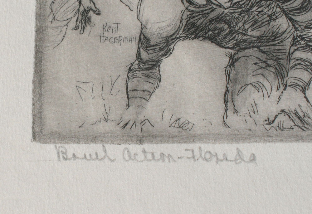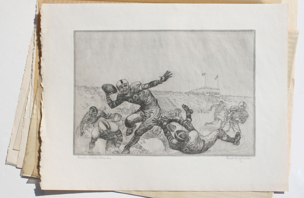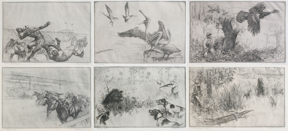 HAGERMAN, Kent, (American, 1893-1978): 6 Etchings, pencil signed and titled, each measuring 10'' x 13'', all unframed. ''Dub's Cast'', ''Out of Nowhere'', ''Tropic Turfs'', ''Florida Tusker'', ''Florida Bear Hunt'', ''Bowl Action'' which depicts a scene taken from the Annual Orange Bowl Classic. Each has individual artist's descriptions of the individual print.